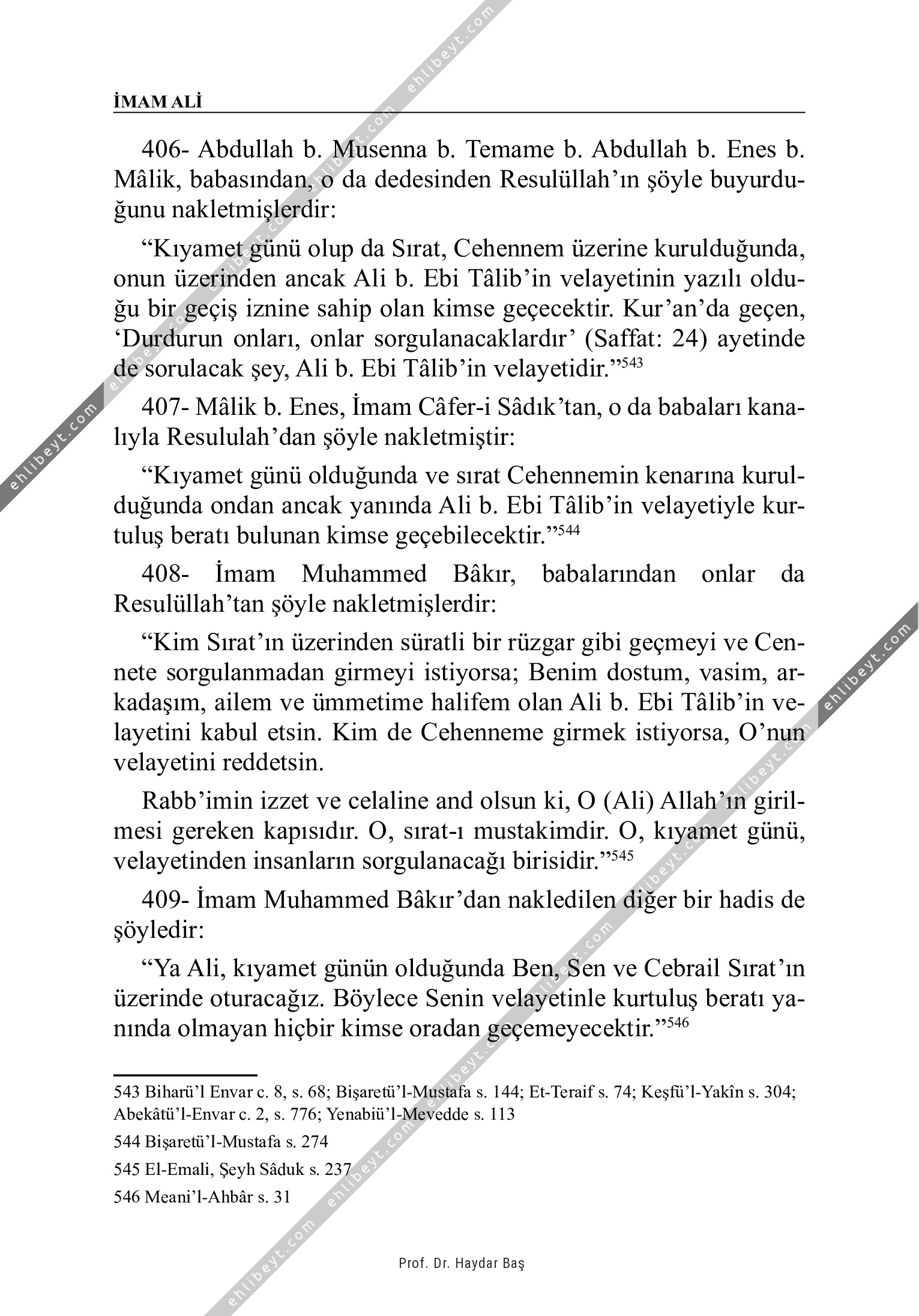 406- Abdullah b. Musenna b. Temame b. Abdullah b. Enes b. Mâlik, babasından, o da dedesinden Resulüllah'ın şöyle buyurduğunu nakletmişlerdir: "Kıyamet günü olup da Sırat, Cehennem üzerine kurulduğunda, onun üzerinden ancak Ali b. Ebi Tâlib'in velayetinin yazılı olduğu bir geçiş iznine sahip olan kimse geçecektir. Kur'an'da geçen, `Durdurun onları, onlar sorgulanacaklardır' (Saffat: 24) ayetinde de sorulacak şey, Ali b. Ebi Tâlib'in velayetidir."543 407- Mâlik b. Enes, İmam Câfer-i Sâdık'tan, o da babaları kanalıyla Resululah'dan şöyle nakletmiştir: "Kıyamet günü olduğunda ve sırat Cehennemin kenarına kurulduğunda ondan ancak yanında Ali b. Ebi Tâlib'in velayetiyle kurtuluş beratı bulunan kimse geçebilecektir."544 408- İmam Muhammed Bâkır, babalarından onlar da Resulüllah'tan şöyle nakletmişlerdir: "Kim Sırat'ın üzerinden süratli bir rüzgar gibi geçmeyi ve Cennete sorgulanmadan girmeyi istiyorsa; Benim dostum, vasim, arkadaşım, ailem ve ümmetime halifem olan Ali b. Ebi Tâlib'in velayetini kabul etsin. Kim de Cehenneme girmek istiyorsa, O'nun […]