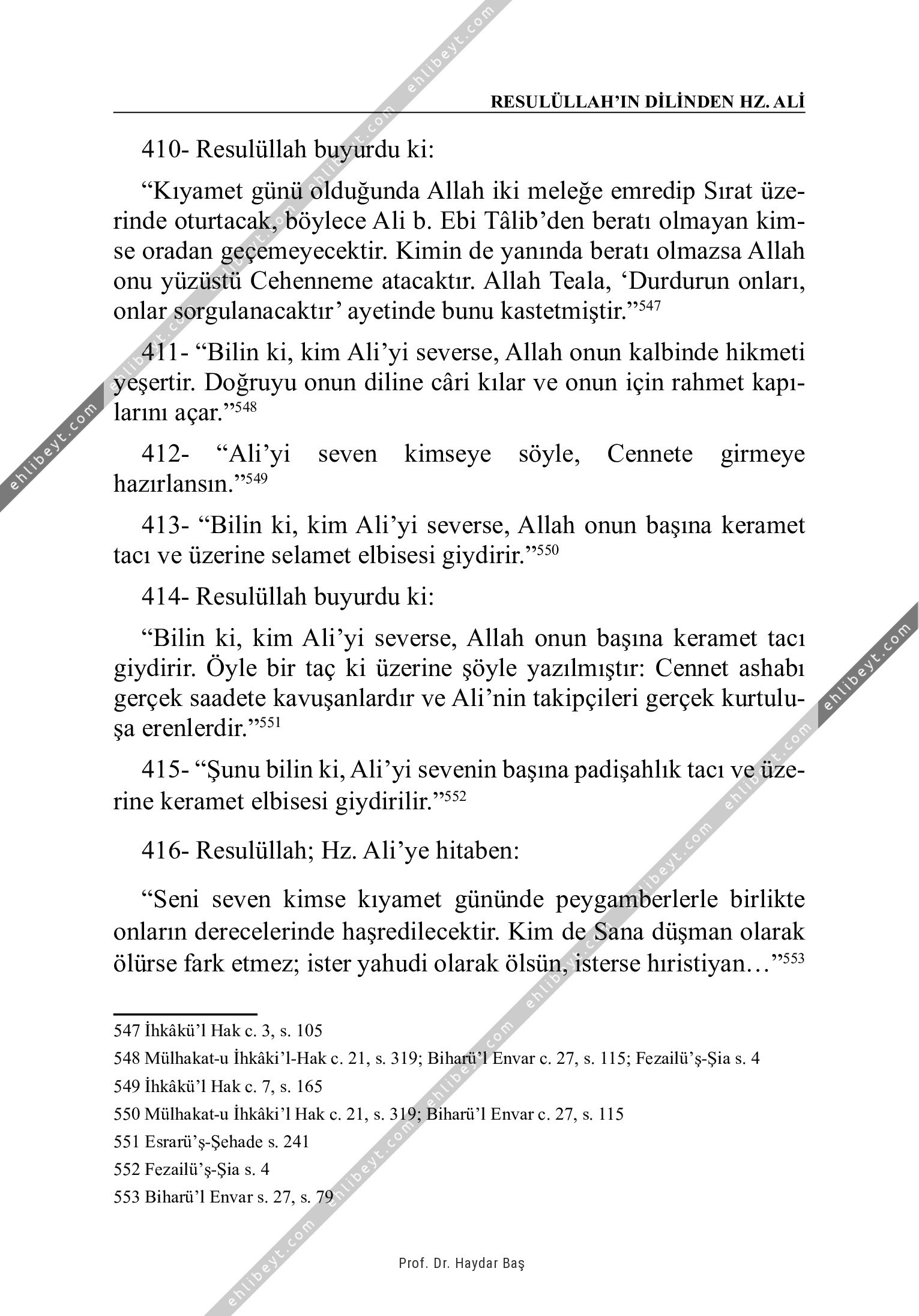 410- Resulüllah buyurdu ki: "Kıyamet günü olduğunda Allah iki meleğe emredip Sırat üzerinde oturtacak, böylece Ali b. Ebi Tâlib'den beratı olmayan kimse oradan geçemeyecektir. Kimin de yanında beratı olmazsa Allah onu yüzüstü Cehenneme atacaktır. Allah Teala, `Durdurun onları, onlar sorgulanacaktır' ayetinde bunu kastetmiştir."547 411- "Bilin ki, kim Ali'yi severse, Allah onun kalbinde hikmeti yeşertir. Doğruyu onun diline câri kılar ve onun için rahmet kapılarını açar."548 412- "Ali'yi seven kimseye söyle, Cennete girmeye hazırlansın."549 413- "Bilin ki, kim Ali'yi severse, Allah onun başına keramet tacı ve üzerine selamet elbisesi giydirir."550 414- Resulüllah buyurdu ki: "Bilin ki, kim Ali'yi severse, Allah onun başına keramet tacı giydirir. Öyle bir taç ki üzerine şöyle yazılmıştır: Cennet ashabı gerçek saadete kavuşanlardır ve Ali'nin takipçileri gerçek kurtuluşa erenlerdir."551 415- "Şunu bilin ki, Ali'yi sevenin başına padişahlık tacı ve üzerine keramet elbisesi giydirilir."552 416- Resulüllah; Hz. Ali'ye hitaben: "Seni seven kimse kıyamet […]
