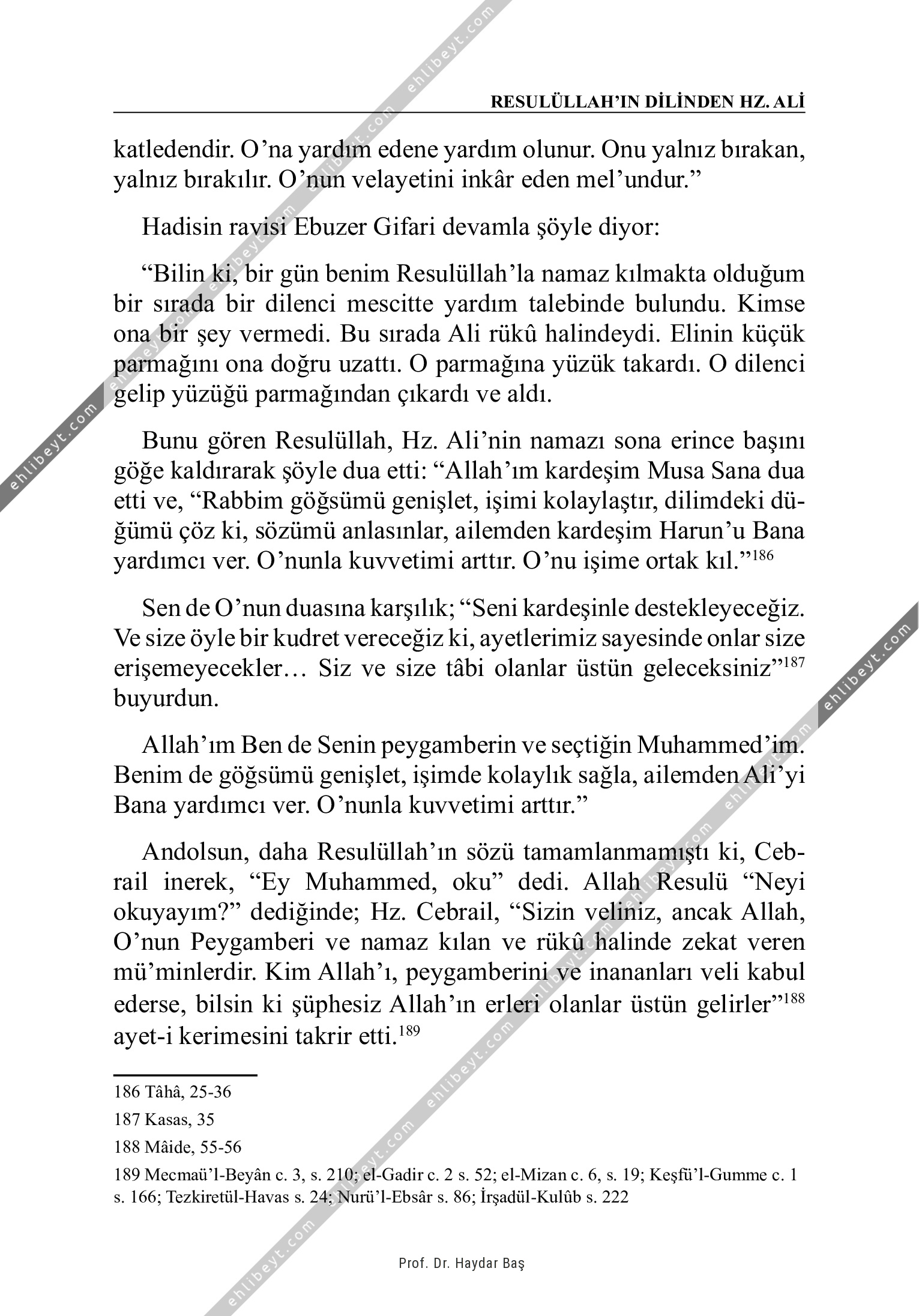 katledendir. O'na yardım edene yardım olunur. Onu yalnız bırakan, yalnız bırakılır. O'nun velayetini inkâr eden mel'undur." Hadisin ravisi Ebuzer Gifari devamla şöyle diyor: "Bilin ki, bir gün benim Resulüllah'la namaz kılmakta olduğum bir sırada bir dilenci mescitte yardım talebinde bulundu. Kimse ona bir şey vermedi. Bu sırada Ali rükû halindeydi. Elinin küçük parmağını ona doğru uzattı. O parmağına yüzük takardı. O dilenci gelip yüzüğü parmağından çıkardı ve aldı. Bunu gören Resulüllah, Hz. Ali'nin namazı sona erince başını göğe kaldırarak şöyle dua etti: "Allah'ım kardeşim Musa Sana dua etti ve, "Rabbim göğsümü genişlet, işimi kolaylaştır, dilimdeki düğümü çöz ki, sözümü anlasınlar, ailemden kardeşim Harun'u Bana yardımcı ver. O'nunla kuvvetimi arttır. O'nu işime ortak kıl."186 Sen de O'nun duasına karşılık; "Seni kardeşinle destekleyeceğiz. Ve size öyle bir kudret vereceğiz ki, ayetlerimiz sayesinde onlar size erişemeyecekler... Siz ve size tâbi olanlar üstün geleceksiniz"187 buyurdun. Allah'ım Ben de Senin peygamberin ve seçtiğin Muhammed'im. […]