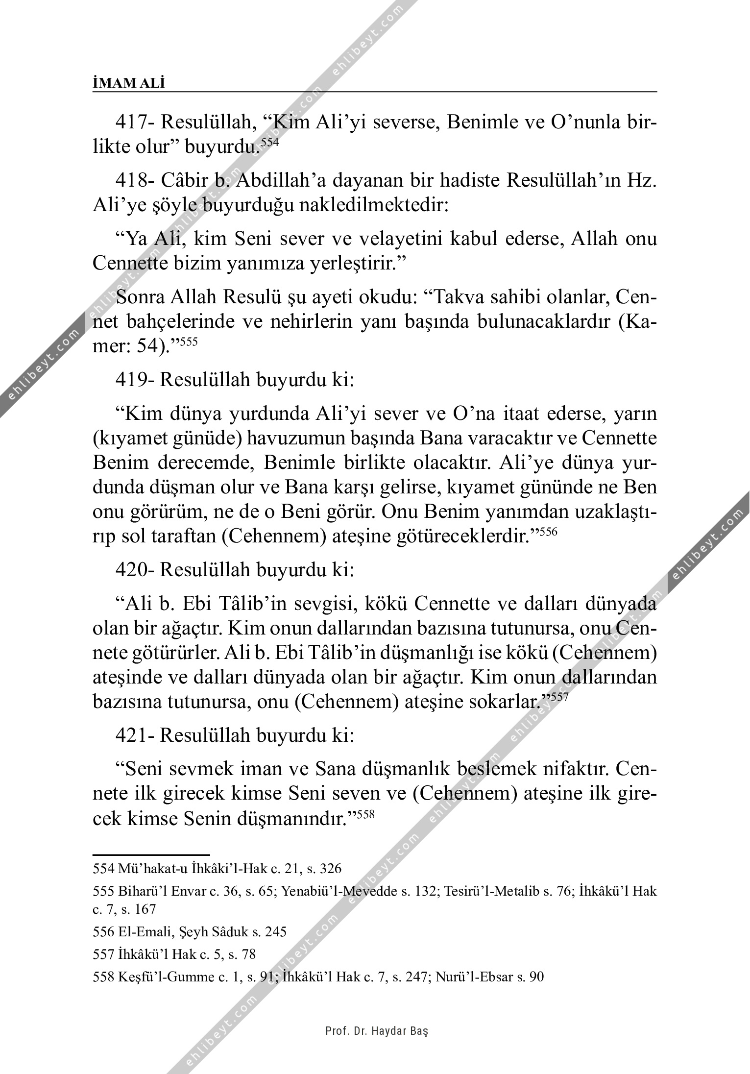 417- Resulüllah, "Kim Ali'yi severse, Benimle ve O'nunla birlikte olur" buyurdu.554 418- Câbir b. Abdillah'a dayanan bir hadiste Resulüllah'ın Hz. Ali'ye şöyle buyurduğu nakledilmektedir: "Ya Ali, kim Seni sever ve velayetini kabul ederse, Allah onu Cennette bizim yanımıza yerleştirir." Sonra Allah Resulü şu ayeti okudu: "Takva sahibi olanlar, Cennet bahçelerinde ve nehirlerin yanı başında bulunacaklardır (Kamer: 54)."555 419- Resulüllah buyurdu ki: "Kim dünya yurdunda Ali'yi sever ve O'na itaat ederse, yarın (kıyamet günüde) havuzumun başında Bana varacaktır ve Cennette Benim derecemde, Benimle birlikte olacaktır. Ali'ye dünya yurdunda düşman olur ve Bana karşı gelirse, kıyamet gününde ne Ben onu görürüm, ne de o Beni görür. Onu Benim yanımdan uzaklaştırıp sol taraftan (Cehennem) ateşine götüreceklerdir."556 420- Resulüllah buyurdu ki: "Ali b. Ebi Tâlib'in sevgisi, kökü Cennette ve dalları dünyada olan bir ağaçtır. Kim onun dallarından bazısına tutunursa, onu Cennete götürürler. Ali b. Ebi Tâlib'in düşmanlığı ise […]