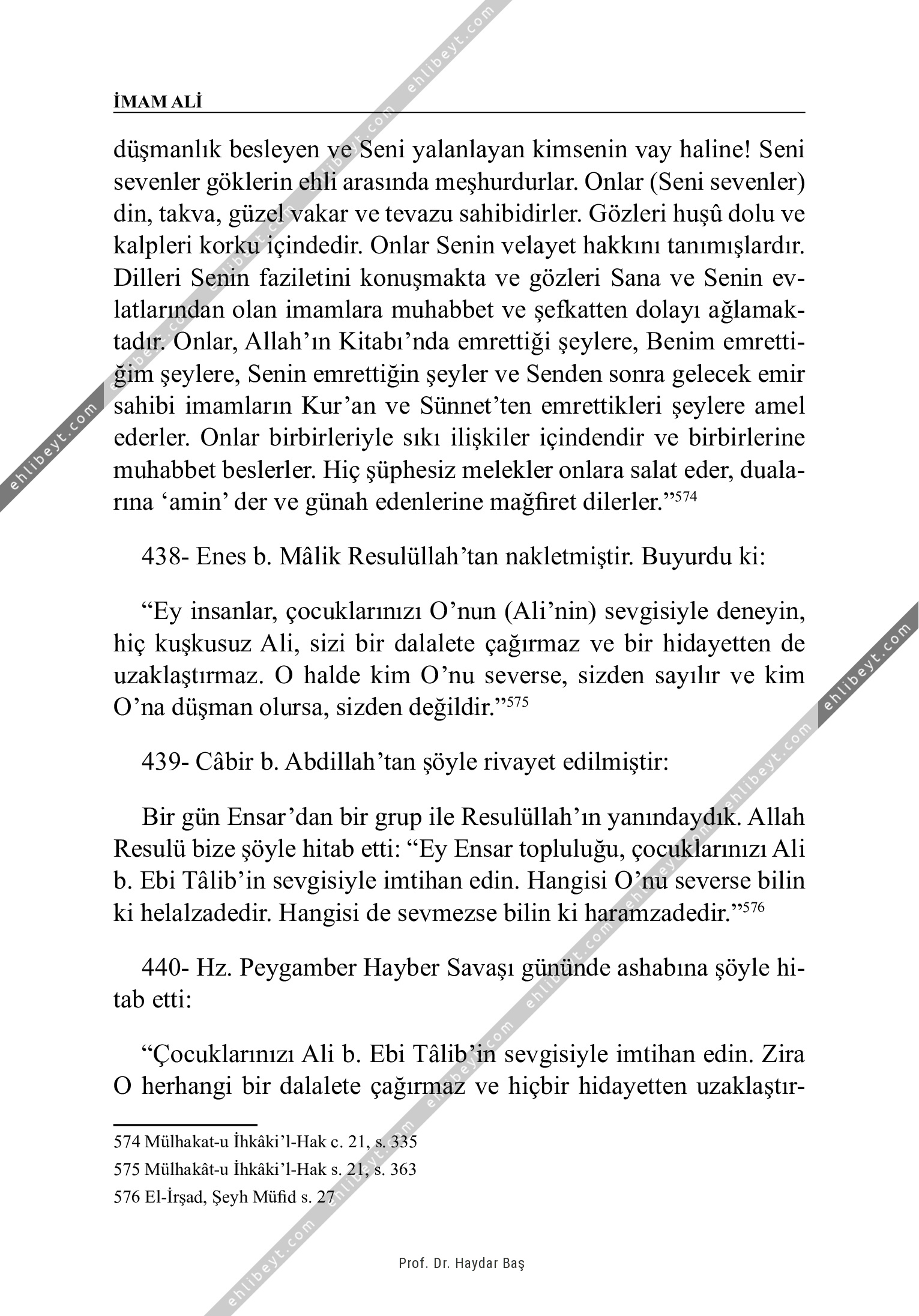 düşmanlık besleyen ve Seni yalanlayan kimsenin vay haline! Seni sevenler göklerin ehli arasında meşhurdurlar. Onlar (Seni sevenler) din, takva, güzel vakar ve tevazu sahibidirler. Gözleri huşû dolu ve kalpleri korku içindedir. Onlar Senin velayet hakkını tanımışlardır. Dilleri Senin faziletini konuşmakta ve gözleri Sana ve Senin evlatlarından olan imamlara muhabbet ve şefkatten dolayı ağlamaktadır. Onlar, Allah'ın Kitabı'nda emrettiği şeylere, Benim emrettiğim şeylere, Senin emrettiğin şeyler ve Senden sonra gelecek emir sahibi imamların Kur'an ve Sünnet'ten emrettikleri şeylere amel ederler. Onlar birbirleriyle sıkı ilişkiler içindendir ve birbirlerine muhabbet beslerler. Hiç şüphesiz melekler onlara salat eder, dualarına `amin' der ve günah edenlerine mağfiret dilerler."574 438- Enes b. Mâlik Resulüllah'tan nakletmiştir. Buyurdu ki: "Ey insanlar, çocuklarınızı O'nun (Ali'nin) sevgisiyle deneyin, hiç kuşkusuz Ali, sizi bir dalalete çağırmaz ve bir hidayetten de uzaklaştırmaz. O halde kim O'nu severse, sizden sayılır ve kim O'na düşman olursa, sizden değildir."575 439- Câbir b. Abdillah'tan […]