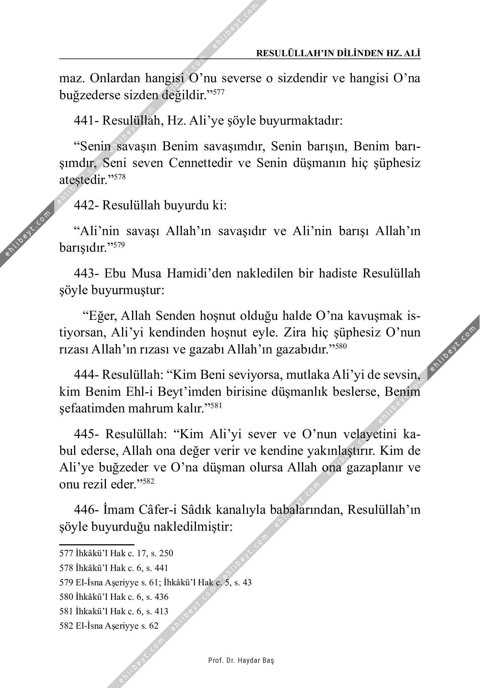 maz. Onlardan hangisi O'nu severse o sizdendir ve hangisi O'na buğzederse sizden değildir."577 441- Resulüllah, Hz. Ali'ye şöyle buyurmaktadır: "Senin savaşın Benim savaşımdır, Senin barışın, Benim barışımdır, Seni seven Cennettedir ve Senin düşmanın hiç şüphesiz ateştedir."578 442- Resulüllah buyurdu ki: "Ali'nin savaşı Allah'ın savaşıdır ve Ali'nin barışı Allah'ın barışıdır."579 443- Ebu Musa Hamidi'den nakledilen bir hadiste Resulüllah şöyle buyurmuştur: "Eğer, Allah Senden hoşnut olduğu halde O'na kavuşmak istiyorsan, Ali'yi kendinden hoşnut eyle. Zira hiç şüphesiz O'nun rızası Allah'ın rızası ve gazabı Allah'ın gazabıdır."580 444- Resulüllah: "Kim Beni seviyorsa, mutlaka Ali'yi de sevsin, kim Benim Ehl-i Beyt'imden birisine düşmanlık beslerse, Benim şefaatimden mahrum kalır."581 445- Resulüllah: "Kim Ali'yi sever ve O'nun velayetini kabul ederse, Allah ona değer verir ve kendine yakınlaştırır. Kim de Ali'ye buğzeder ve O'na düşman olursa Allah ona gazaplanır ve onu rezil eder."582 446- İmam Câfer-i Sâdık kanalıyla babalarından, Resulüllah'ın şöyle buyurduğu nakledilmiştir: 577 İhkâkü'l […]
