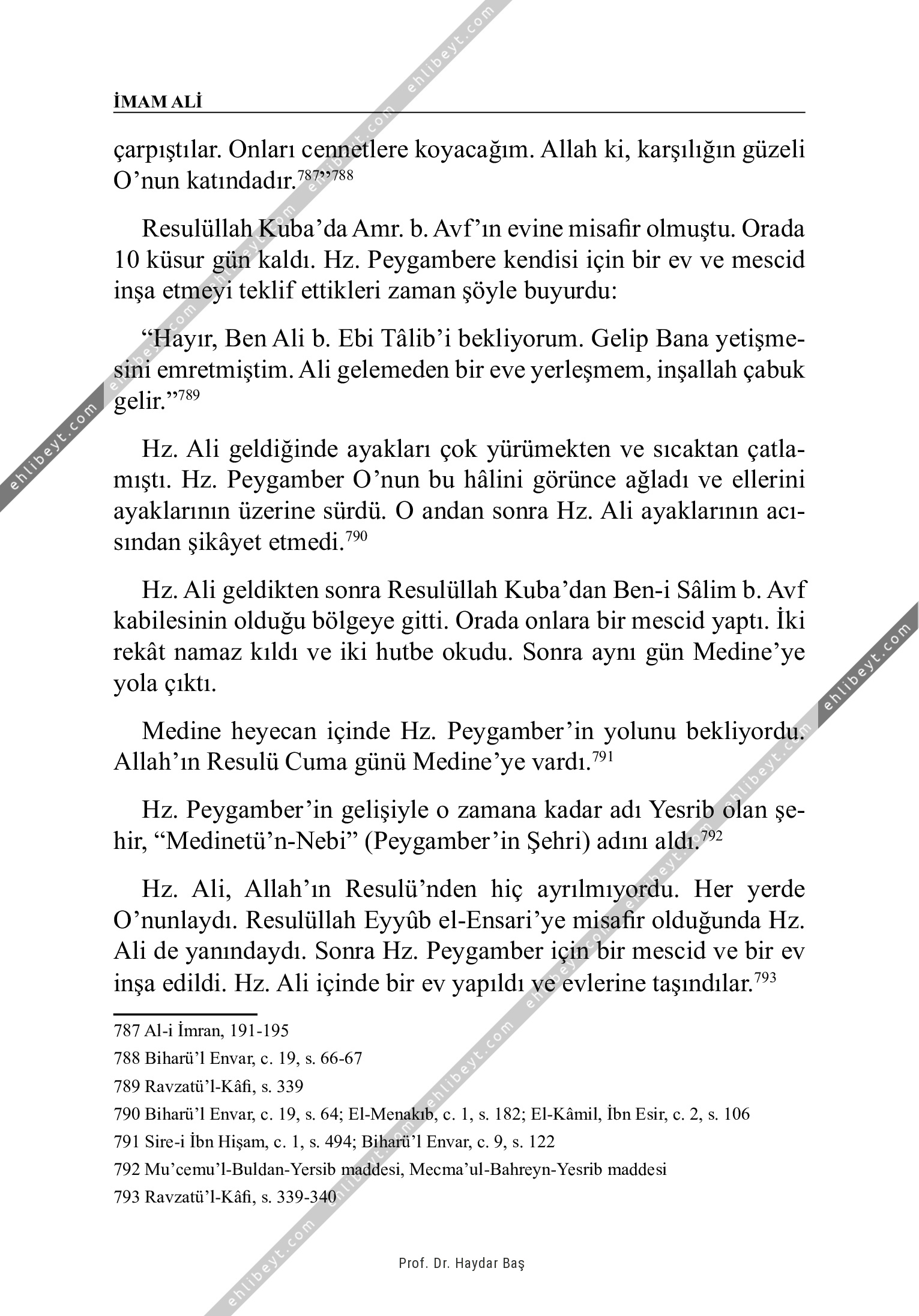 çarpıştılar. Onları cennetlere koyacağım. Allah ki, karşılığın güzeli O'nun katındadır.787"788 Resulüllah Kuba'da Amr. b. Avf'ın evine misafir olmuştu. Orada 10 küsur gün kaldı. Hz. Peygambere kendisi için bir ev ve mescid inşa etmeyi teklif ettikleri zaman şöyle buyurdu: "Hayır, Ben Ali b. Ebi Tâlib'i bekliyorum. Gelip Bana yetişmesini emretmiştim. Ali gelemeden bir eve yerleşmem, inşallah çabuk gelir."789 Hz. Ali geldiğinde ayakları çok yürümekten ve sıcaktan çatlamıştı. Hz. Peygamber O'nun bu hâlini görünce ağladı ve ellerini ayaklarının üzerine sürdü. O andan sonra Hz. Ali ayaklarının acısından şikâyet etmedi.790 Hz. Ali geldikten sonra Resulüllah Kuba'dan Ben-i Sâlim b. Avf kabilesinin olduğu bölgeye gitti. Orada onlara bir mescid yaptı. İki rekât namaz kıldı ve iki hutbe okudu. Sonra aynı gün Medine'ye yola çıktı. Medine heyecan içinde Hz. Peygamber'in yolunu bekliyordu. Allah'ın Resulü Cuma günü Medine'ye vardı.791 Hz. Peygamber'in gelişiyle o zamana kadar adı Yesrib olan şehir, "Medinetü'n-Nebi" (Peygamber'in Şehri) […]