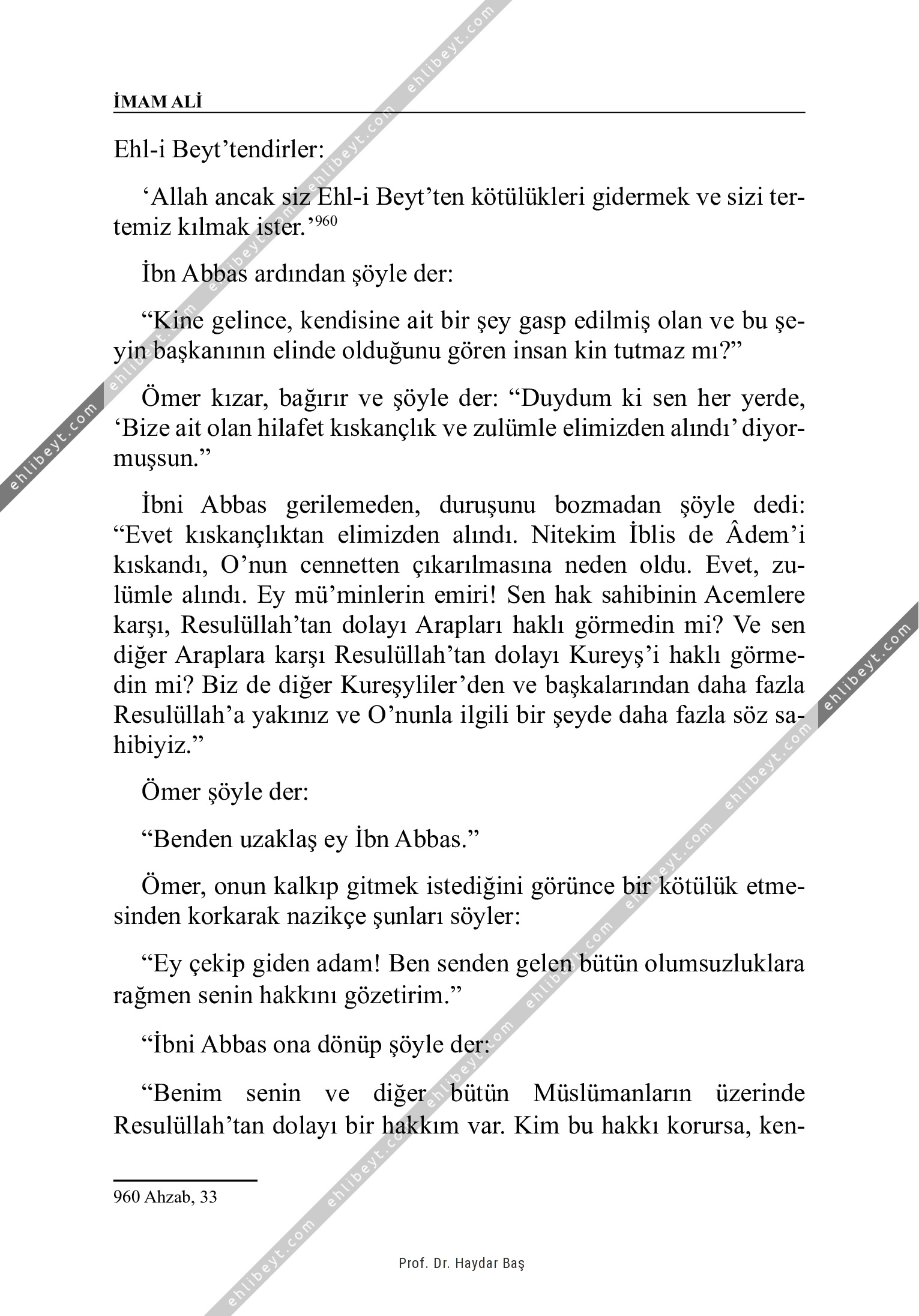 Ehl-i Beyt'tendirler: `Allah ancak siz Ehl-i Beyt'ten kötülükleri gidermek ve sizi tertemiz kılmak ister.'960 İbn Abbas ardından şöyle der: "Kine gelince, kendisine ait bir şey gasp edilmiş olan ve bu şeyin başkanının elinde olduğunu gören insan kin tutmaz mı?" Ömer kızar, bağırır ve şöyle der: "Duydum ki sen her yerde, `Bize ait olan hilafet kıskançlık ve zulümle elimizden alındı' diyormuşsun." İbni Abbas gerilemeden, duruşunu bozmadan şöyle dedi: "Evet kıskançlıktan elimizden alındı. Nitekim İblis de Âdem'i kıskandı, O'nun cennetten çıkarılmasına neden oldu. Evet, zulümle alındı. Ey mü'minlerin emiri! Sen hak sahibinin Acemlere karşı, Resulüllah'tan dolayı Arapları haklı görmedin mi? Ve sen diğer Araplara karşı Resulüllah'tan dolayı Kureyş'i haklı görmedin mi? Biz de diğer Kureşyliler'den ve başkalarından daha fazla Resulüllah'a yakınız ve O'nunla ilgili bir şeyde daha fazla söz sahibiyiz." Ömer şöyle der: "Benden uzaklaş ey İbn Abbas." Ömer, onun kalkıp gitmek istediğini görünce bir kötülük […]