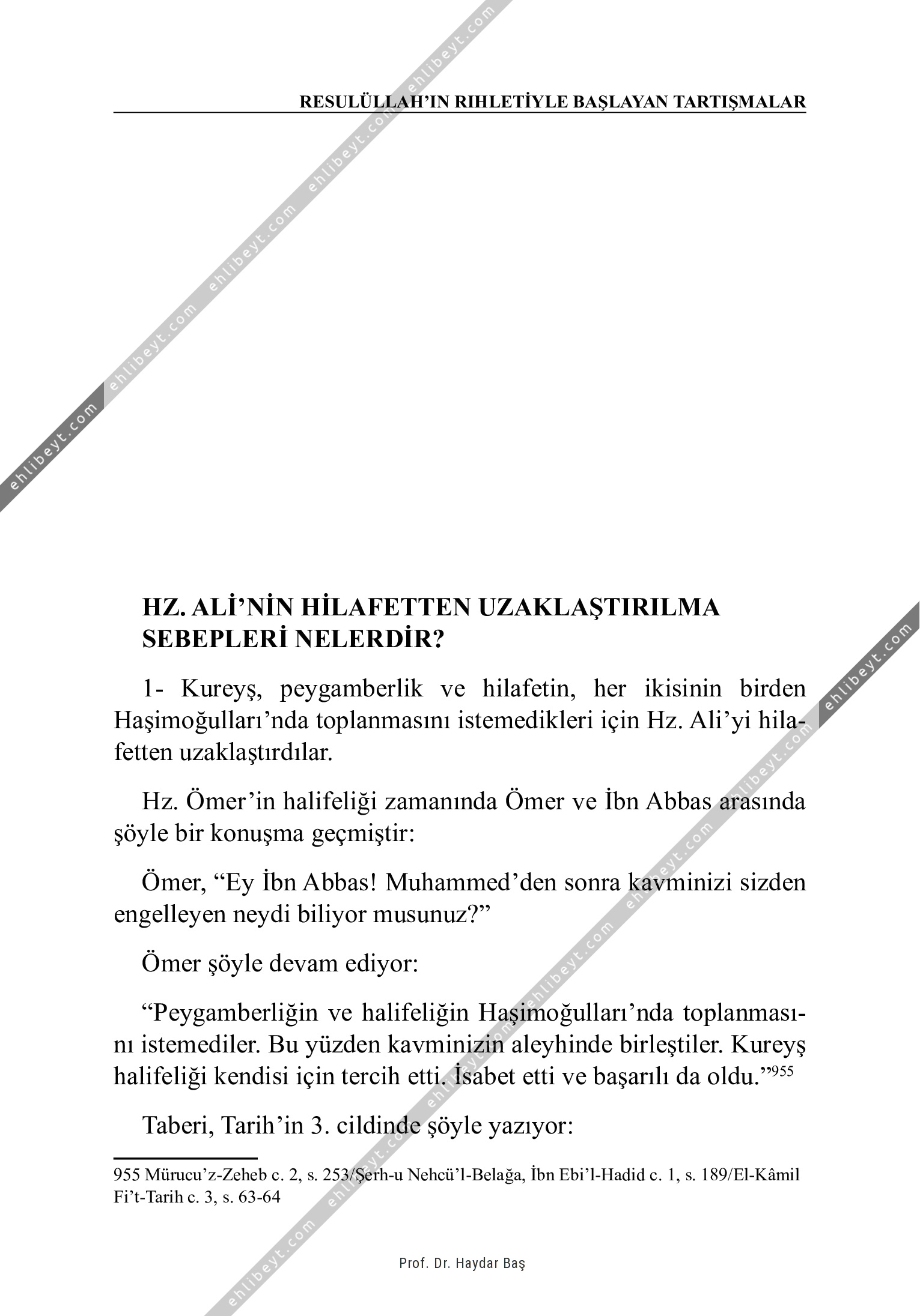 1- Kureyş, peygamberlik ve hilafetin, her ikisinin birden Haşimoğulları'nda toplanmasını istemedikleri için Hz. Ali'yi hilafetten uzaklaştırdılar. Hz. Ömer'in halifeliği zamanında Ömer ve İbn Abbas arasında şöyle bir konuşma geçmiştir: Ömer, "Ey İbn Abbas! Muhammed'den sonra kavminizi sizden engelleyen neydi biliyor musunuz?" Ömer şöyle devam ediyor: "Peygamberliğin ve halifeliğin Haşimoğulları'nda toplanmasını istemediler. Bu yüzden kavminizin aleyhinde birleştiler. Kureyş halifeliği kendisi için tercih etti. İsabet etti ve başarılı da oldu."955 Taberi, Tarih'in 3. cildinde şöyle yazıyor: 955 Mürucu'z-Zeheb c. 2, s. 253/Şerh-u Nehcü'l-Belağa, İbn Ebi'l-Hadid c. 1, s. 189/El-Kâmil Fi't-Tarih c. 3, s. 63-64