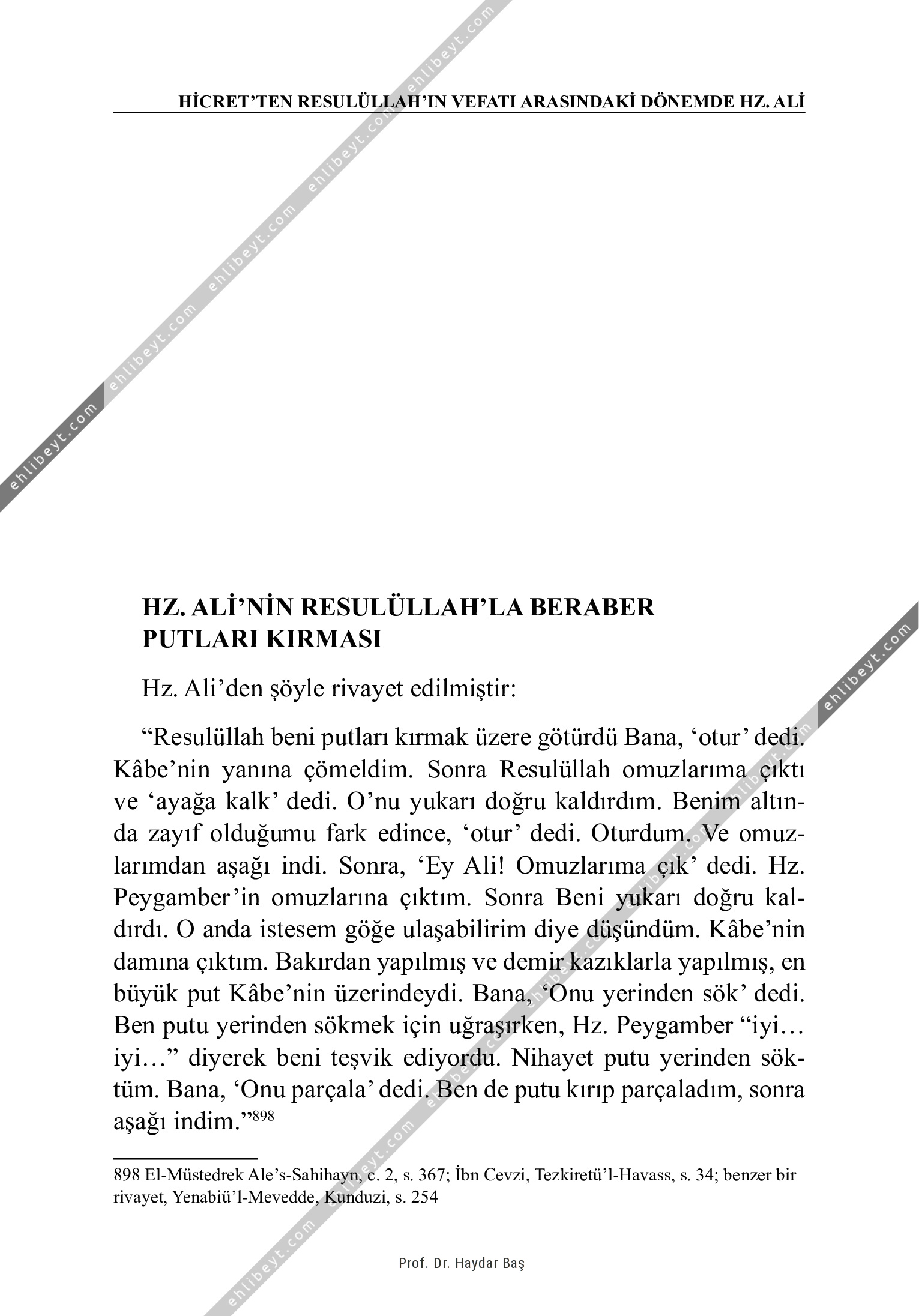 Hz. Ali'den şöyle rivayet edilmiştir: "Resulüllah beni putları kırmak üzere götürdü Bana, `otur' dedi. Kâbe'nin yanına çömeldim. Sonra Resulüllah omuzlarıma çıktı ve `ayağa kalk' dedi. O'nu yukarı doğru kaldırdım. Benim altında zayıf olduğumu fark edince, `otur' dedi. Oturdum. Ve omuzlarımdan aşağı indi. Sonra, `Ey Ali! Omuzlarıma çık' dedi. Hz. Peygamber'in omuzlarına çıktım. Sonra Beni yukarı doğru kaldırdı. O anda istesem göğe ulaşabilirim diye düşündüm. Kâbe'nin damına çıktım. Bakırdan yapılmış ve demir kazıklarla yapılmış, en büyük put Kâbe'nin üzerindeydi. Bana, `Onu yerinden sök' dedi. Ben putu yerinden sökmek için uğraşırken, Hz. Peygamber "iyi... iyi..." diyerek beni teşvik ediyordu. Nihayet putu yerinden söktüm. Bana, `Onu parçala' dedi. Ben de putu kırıp parçaladım, sonra aşağı indim."898 898 El-Müstedrek Ale's-Sahihayn, c. 2, s. 367; İbn Cevzi, Tezkiretü'l-Havass, s. 34; benzer bir rivayet, Yenabiü'l-Mevedde, Kunduzi, s. 254