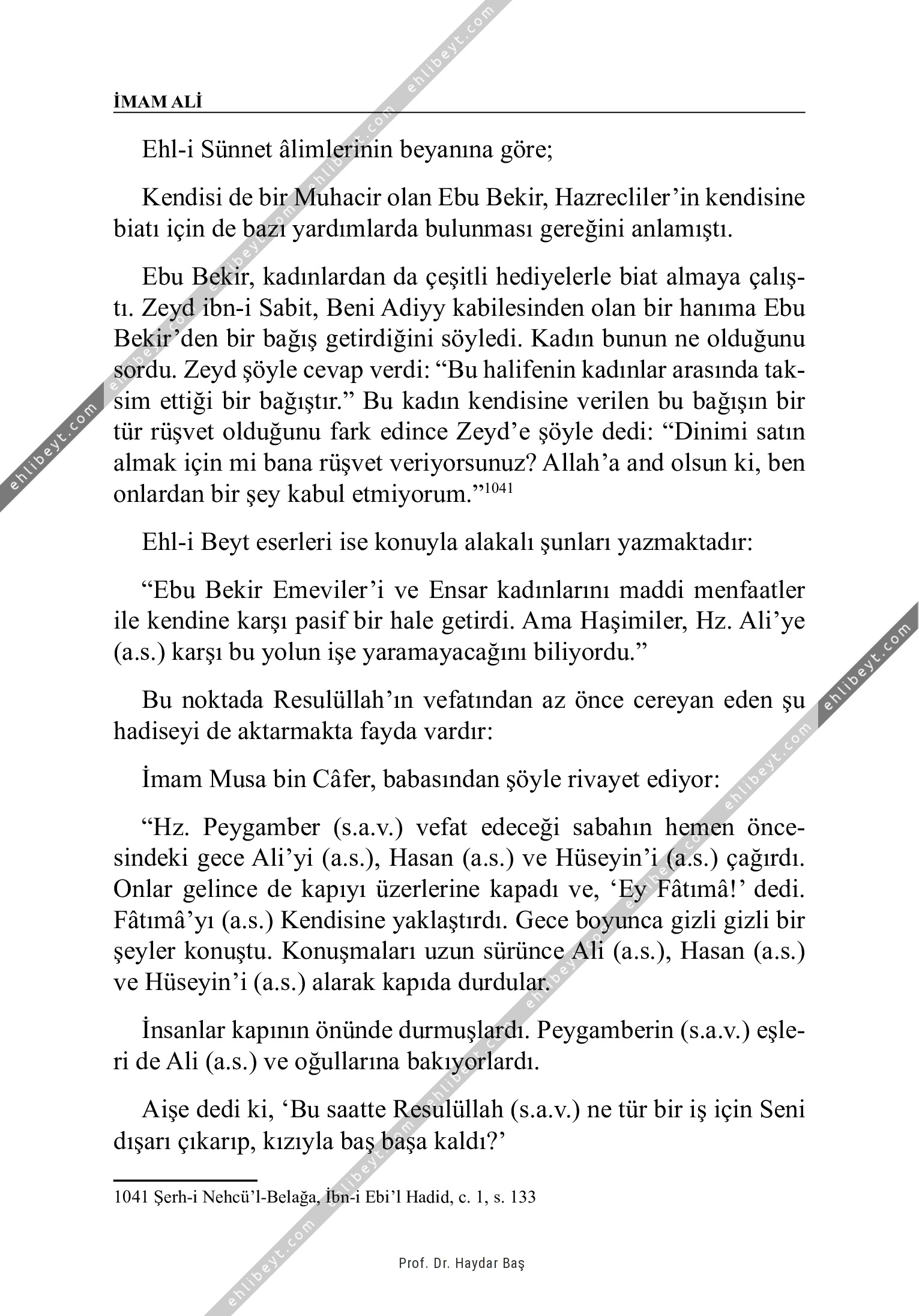 Ehl-i Sünnet âlimlerinin beyanına göre; Kendisi de bir Muhacir olan Ebu Bekir, Hazrecliler'in kendisine biatı için de bazı yardımlarda bulunması gereğini anlamıştı. Ebu Bekir, kadınlardan da çeşitli hediyelerle biat almaya çalıştı. Zeyd ibn-i Sabit, Beni Adiyy kabilesinden olan bir hanıma Ebu Bekir'den bir bağış getirdiğini söyledi. Kadın bunun ne olduğunu sordu. Zeyd şöyle cevap verdi: "Bu halifenin kadınlar arasında taksim ettiği bir bağıştır." Bu kadın kendisine verilen bu bağışın bir tür rüşvet olduğunu fark edince Zeyd'e şöyle dedi: "Dinimi satın almak için mi bana rüşvet veriyorsunuz? Allah'a and olsun ki, ben onlardan bir şey kabul etmiyorum."1041 Ehl-i Beyt eserleri ise konuyla alakalı şunları yazmaktadır: "Ebu Bekir Emeviler'i ve Ensar kadınlarını maddi menfaatler ile kendine karşı pasif bir hale getirdi. Ama Haşimiler, Hz. Ali'ye (a.s.) karşı bu yolun işe yaramayacağını biliyordu." Bu noktada Resulüllah'ın vefatından az önce cereyan eden şu hadiseyi de aktarmakta fayda vardır: İmam Musa bin Câfer, […]