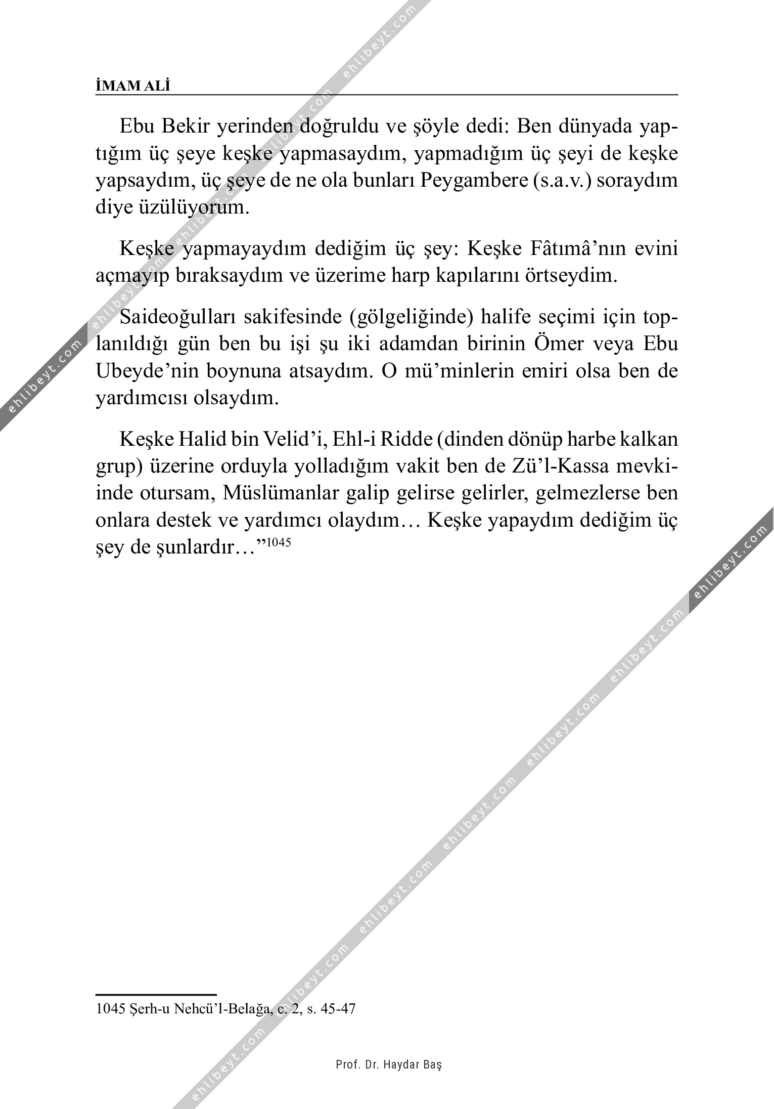 Ebu Bekir yerinden doğruldu ve şöyle dedi: Ben dünyada yaptığım üç şeye keşke yapmasaydım, yapmadığım üç şeyi de keşke yapsaydım, üç şeye de ne ola bunları Peygambere (s.a.v.) soraydım diye üzülüyorum. Keşke yapmayaydım dediğim üç şey: Keşke Fâtımâ'nın evini açmayıp bıraksaydım ve üzerime harp kapılarını örtseydim. Saideoğulları sakifesinde (gölgeliğinde) halife seçimi için toplanıldığı gün ben bu işi şu iki adamdan birinin Ömer veya Ebu Ubeyde'nin boynuna atsaydım. O mü'minlerin emiri olsa ben de yardımcısı olsaydım. Keşke Halid bin Velid'i, Ehl-i Ridde (dinden dönüp harbe kalkan grup) üzerine orduyla yolladığım vakit ben de Zü'l-Kassa mevkiinde otursam, Müslümanlar galip gelirse gelirler, gelmezlerse ben onlara destek ve yardımcı olaydım... Keşke yapaydım dediğim üç şey de şunlardır..."1045   1045 Şerh-u Nehcü'l-Belağa, c. 2, s. 45-47