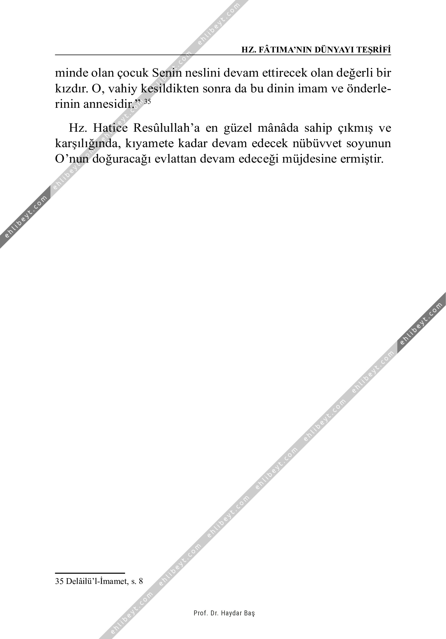 minde olan çocuk Senin neslini devam ettirecek olan değerli bir kızdır. O, vahiy kesildikten sonra da bu dinin imam ve önderlerinin annesidir." 35 Hz. Hatice Resûlullah'a en güzel mânâda sahip çıkmış ve karşılığında, kıyamete kadar devam edecek nübüvvet soyunun O'nun doğuracağı evlattan devam edeceği müjdesine ermiştir.   35 Delâilü'l-İmamet, s. 8