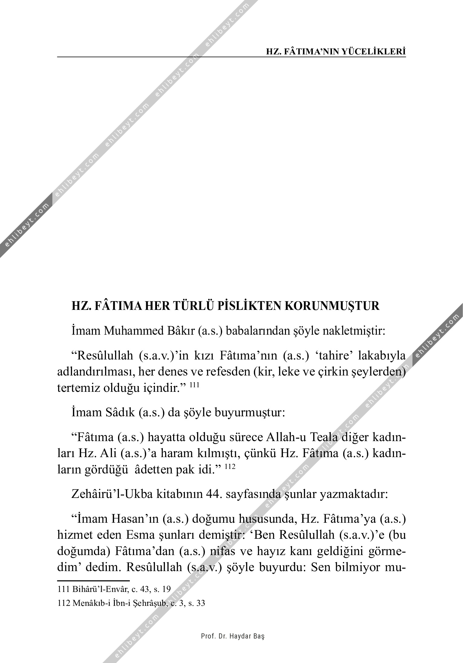 İmam Muhammed Bâkır (a.s.) babalarından şöyle nakletmiştir: "Resûlullah (s.a.v.)'in kızı Fâtıma'nın (a.s.) `tahire' lakabıyla adlandırılması, her denes ve refesden (kir, leke ve çirkin şeylerden) tertemiz olduğu içindir." 111 İmam Sâdık (a.s.) da şöyle buyurmuştur: "Fâtıma (a.s.) hayatta olduğu sürece Allah-u Teala diğer kadınları Hz. Ali (a.s.)'a haram kılmıştı, çünkü Hz. Fâtıma (a.s.) kadınların gördüğü âdetten pak idi." 112 Zehâirü'l-Ukba kitabının 44. sayfasında şunlar yazmaktadır: "İmam Hasan'ın (a.s.) doğumu hususunda, Hz. Fâtıma'ya (a.s.) hizmet eden Esma şunları demiştir: `Ben Resûlullah (s.a.v.)'e (bu doğumda) Fâtıma'dan (a.s.) nifas ve hayız kanı geldiğini görmedim' dedim. Resûlullah (s.a.v.) şöyle buyurdu: Sen bilmiyor mu111 Bihârü'l-Envâr, c. 43, s. 19 112 Menâkıb-i İbn-i Şehrâşub, c. 3, s. 33