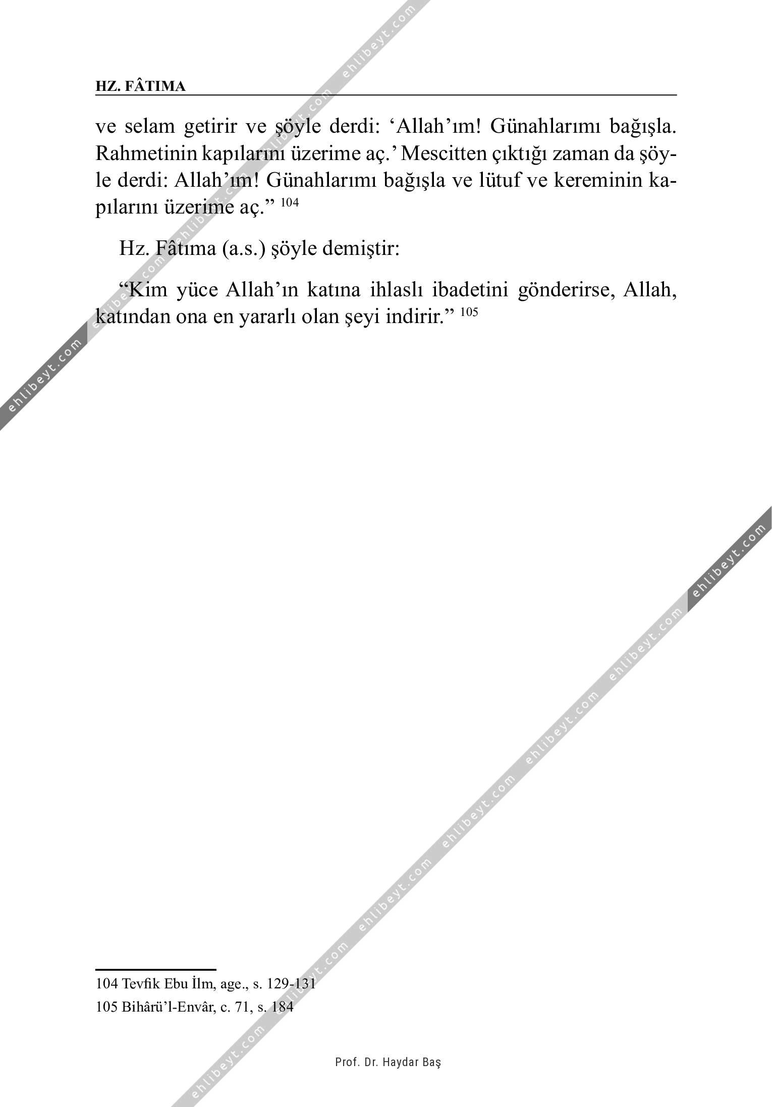 ve selam getirir ve şöyle derdi: `Allah'ım! Günahlarımı bağışla. Rahmetinin kapılarını üzerime aç.' Mescitten çıktığı zaman da şöyle derdi: Allah'ım! Günahlarımı bağışla ve lütuf ve kereminin kapılarını üzerime aç." 104 Hz. Fâtıma (a.s.) şöyle demiştir: "Kim yüce Allah'ın katına ihlaslı ibadetini gönderirse, Allah, katından ona en yararlı olan şeyi indirir." 105 104 Tevfik Ebu İlm, age., s. 129-131 105 Bihârü'l-Envâr, c. 71, s. 184