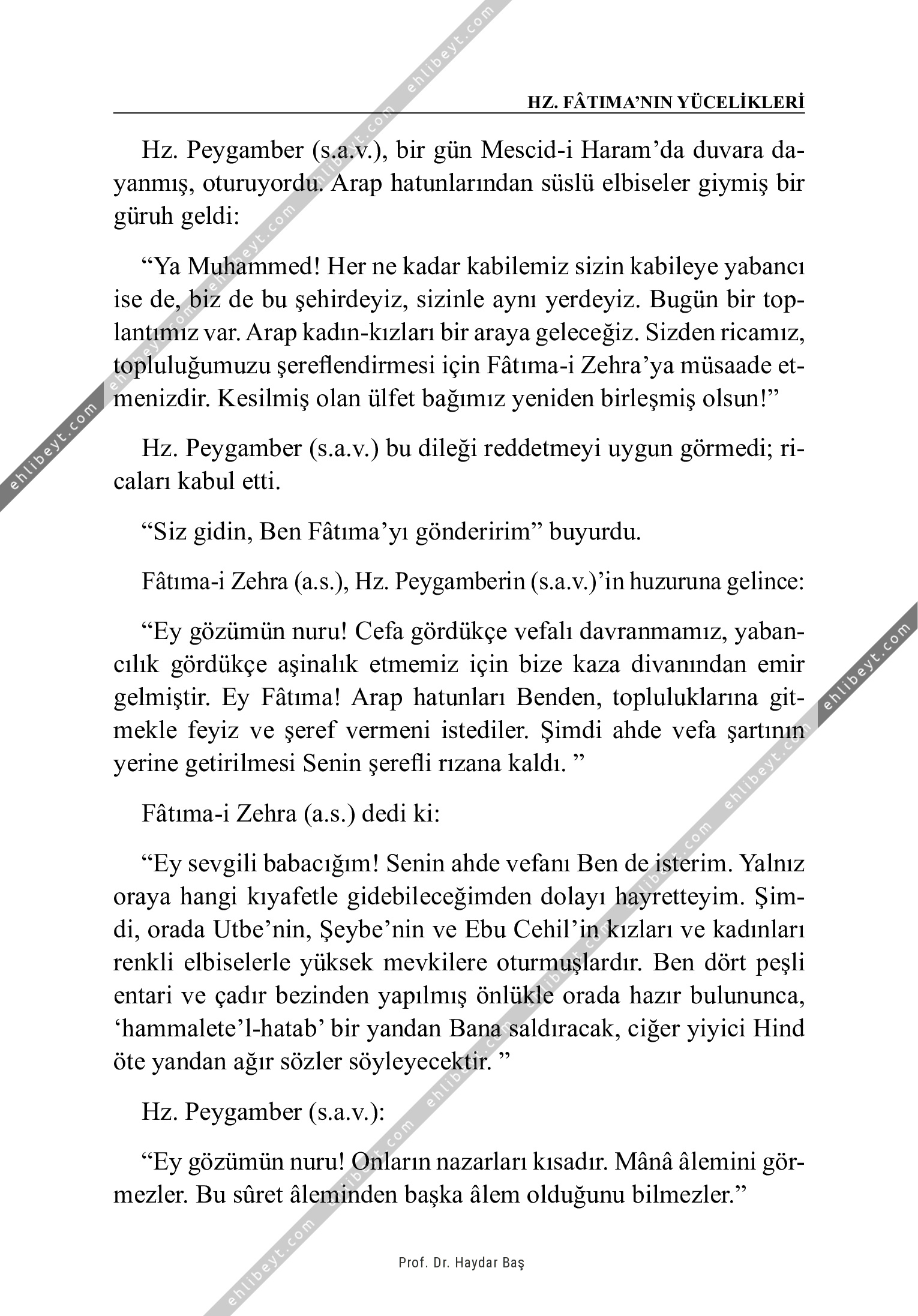 Hz. Peygamber (s.a.v.), bir gün Mescid-i Haram'da duvara dayanmış, oturuyordu. Arap hatunlarından süslü elbiseler giymiş bir güruh geldi: "Ya Muhammed! Her ne kadar kabilemiz sizin kabileye yabancı ise de, biz de bu şehirdeyiz, sizinle aynı yerdeyiz. Bugün bir toplantımız var. Arap kadın-kızları bir araya geleceğiz. Sizden ricamız, topluluğumuzu şereflendirmesi için Fâtıma-i Zehra'ya müsaade etmenizdir. Kesilmiş olan ülfet bağımız yeniden birleşmiş olsun!" Hz. Peygamber (s.a.v.) bu dileği reddetmeyi uygun görmedi; ricaları kabul etti. "Siz gidin, Ben Fâtıma'yı gönderirim" buyurdu. Fâtıma-i Zehra (a.s.), Hz. Peygamberin (s.a.v.)'in huzuruna gelince: "Ey gözümün nuru! Cefa gördükçe vefalı davranmamız, yabancılık gördükçe aşinalık etmemiz için bize kaza divanından emir gelmiştir. Ey Fâtıma! Arap hatunları Benden, topluluklarına gitmekle feyiz ve şeref vermeni istediler. Şimdi ahde vefa şartının yerine getirilmesi Senin şerefli rızana kaldı. " Fâtıma-i Zehra (a.s.) dedi ki: "Ey sevgili babacığım! Senin ahde vefanı Ben de isterim. Yalnız oraya hangi kıyafetle […]
