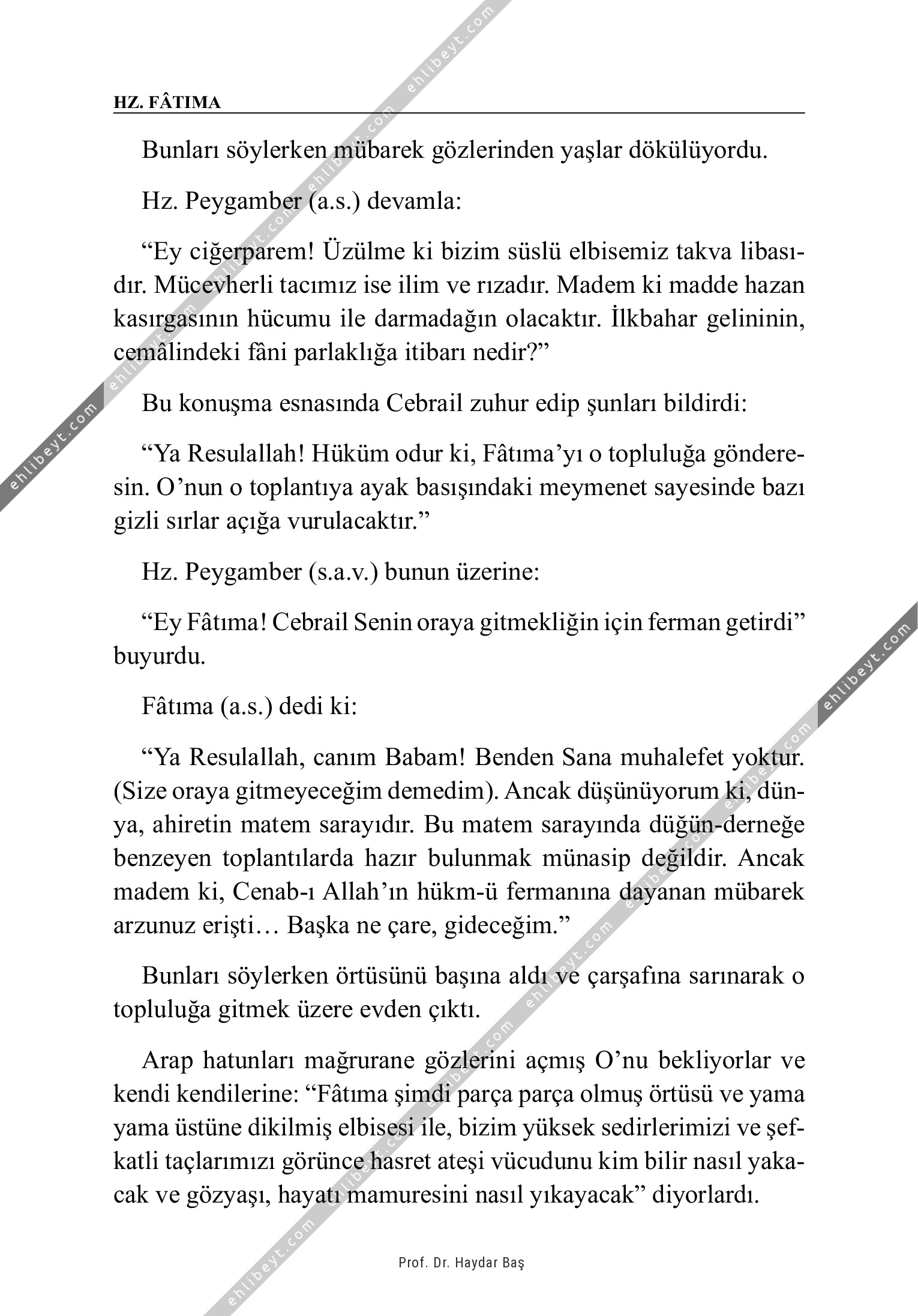 Bunları söylerken mübarek gözlerinden yaşlar dökülüyordu. Hz. Peygamber (a.s.) devamla: "Ey ciğerparem! Üzülme ki bizim süslü elbisemiz takva libasıdır. Mücevherli tacımız ise ilim ve rızadır. Madem ki madde hazan kasırgasının hücumu ile darmadağın olacaktır. İlkbahar gelininin, cemâlindeki fâni parlaklığa itibarı nedir?" Bu konuşma esnasında Cebrail zuhur edip şunları bildirdi: "Ya Resulallah! Hüküm odur ki, Fâtıma'yı o topluluğa gönderesin. O'nun o toplantıya ayak basışındaki meymenet sayesinde bazı gizli sırlar açığa vurulacaktır." Hz. Peygamber (s.a.v.) bunun üzerine: "Ey Fâtıma! Cebrail Senin oraya gitmekliğin için ferman getirdi" buyurdu. Fâtıma (a.s.) dedi ki: "Ya Resulallah, canım Babam! Benden Sana muhalefet yoktur. (Size oraya gitmeyeceğim demedim). Ancak düşünüyorum ki, dünya, ahiretin matem sarayıdır. Bu matem sarayında düğün-derneğe benzeyen toplantılarda hazır bulunmak münasip değildir. Ancak madem ki, Cenab-ı Allah'ın hükm-ü fermanına dayanan mübarek arzunuz erişti... Başka ne çare, gideceğim." Bunları söylerken örtüsünü başına aldı ve çarşafına sarınarak o topluluğa gitmek üzere evden çıktı. […]