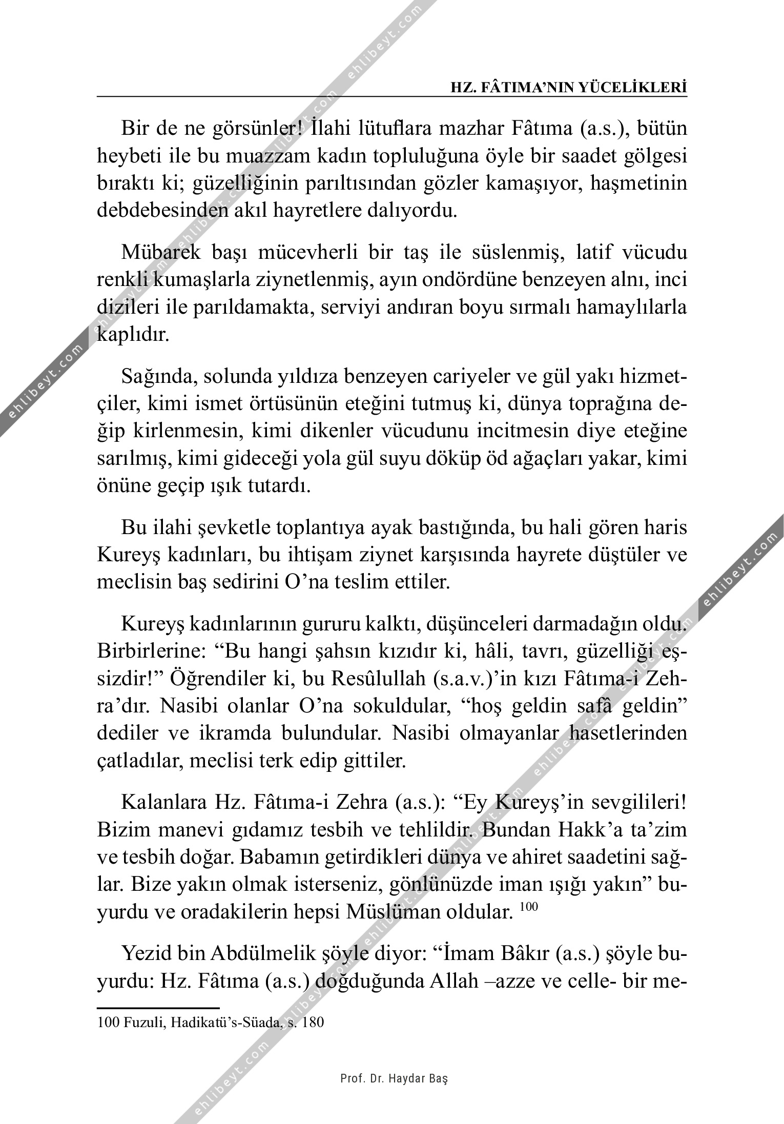 Bir de ne görsünler! İlahi lütuflara mazhar Fâtıma (a.s.), bütün heybeti ile bu muazzam kadın topluluğuna öyle bir saadet gölgesi bıraktı ki; güzelliğinin parıltısından gözler kamaşıyor, haşmetinin debdebesinden akıl hayretlere dalıyordu. Mübarek başı mücevherli bir taş ile süslenmiş, latif vücudu renkli kumaşlarla ziynetlenmiş, ayın ondördüne benzeyen alnı, inci dizileri ile parıldamakta, serviyi andıran boyu sırmalı hamaylılarla kaplıdır. Sağında, solunda yıldıza benzeyen cariyeler ve gül yakı hizmetçiler, kimi ismet örtüsünün eteğini tutmuş ki, dünya toprağına değip kirlenmesin, kimi dikenler vücudunu incitmesin diye eteğine sarılmış, kimi gideceği yola gül suyu döküp öd ağaçları yakar, kimi önüne geçip ışık tutardı. Bu ilahi şevketle toplantıya ayak bastığında, bu hali gören haris Kureyş kadınları, bu ihtişam ziynet karşısında hayrete düştüler ve meclisin baş sedirini O'na teslim ettiler. Kureyş kadınlarının gururu kalktı, düşünceleri darmadağın oldu. Birbirlerine: "Bu hangi şahsın kızıdır ki, hâli, tavrı, güzelliği eşsizdir!" Öğrendiler ki, bu Resûlullah (s.a.v.)'in kızı Fâtıma-i Zeh[…]