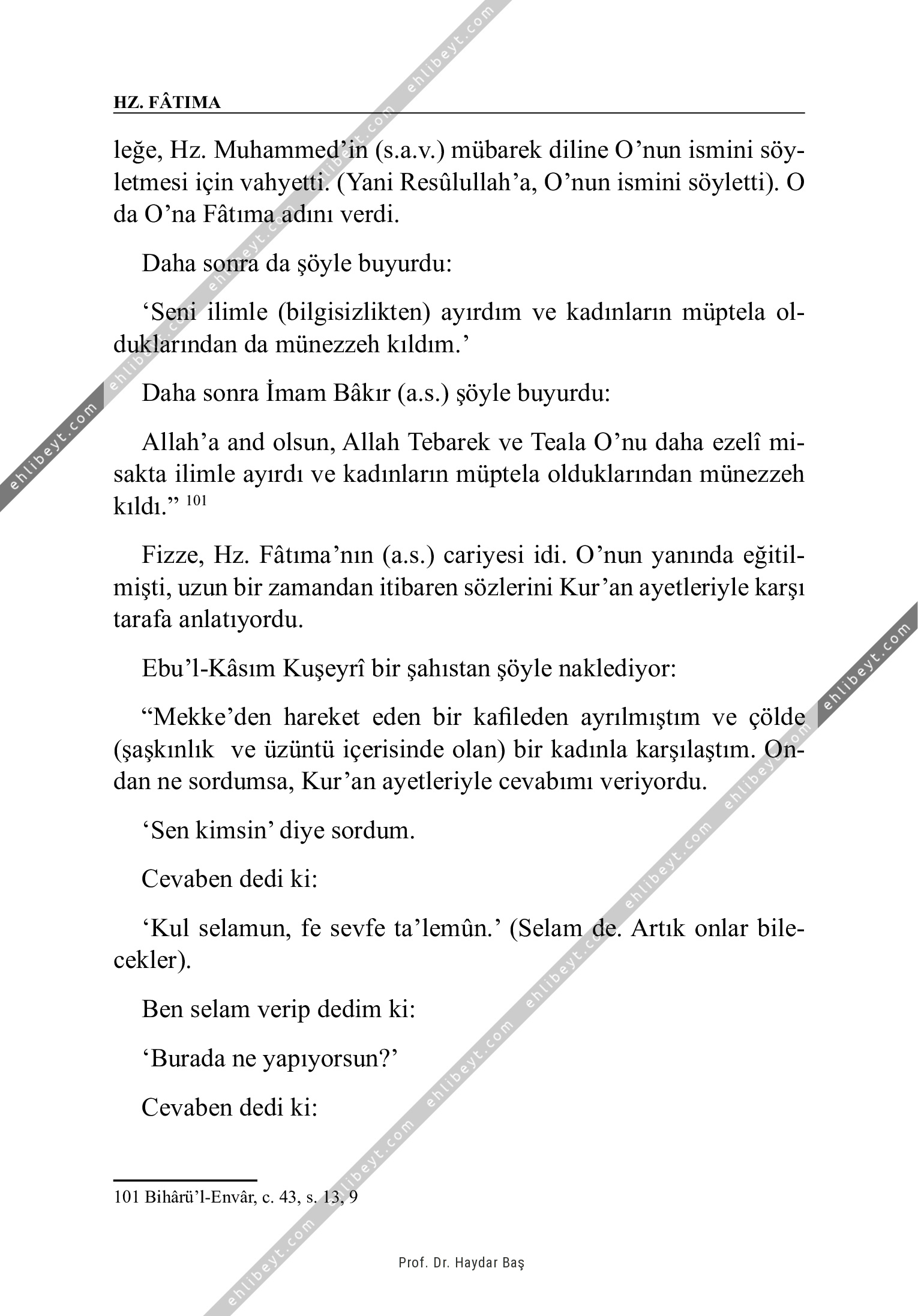 leğe, Hz. Muhammed'in (s.a.v.) mübarek diline O'nun ismini söyletmesi için vahyetti. (Yani Resûlullah'a, O'nun ismini söyletti). O da O'na Fâtıma adını verdi. Daha sonra da şöyle buyurdu: `Seni ilimle (bilgisizlikten) ayırdım ve kadınların müptela olduklarından da münezzeh kıldım.' Daha sonra İmam Bâkır (a.s.) şöyle buyurdu: Allah'a and olsun, Allah Tebarek ve Teala O'nu daha ezelî misakta ilimle ayırdı ve kadınların müptela olduklarından münezzeh kıldı." 101 Fizze, Hz. Fâtıma'nın (a.s.) cariyesi idi. O'nun yanında eğitilmişti, uzun bir zamandan itibaren sözlerini Kur'an ayetleriyle karşı tarafa anlatıyordu. Ebu'l-Kâsım Kuşeyrî bir şahıstan şöyle naklediyor: "Mekke'den hareket eden bir kafileden ayrılmıştım ve çölde (şaşkınlık ve üzüntü içerisinde olan) bir kadınla karşılaştım. Ondan ne sordumsa, Kur'an ayetleriyle cevabımı veriyordu. `Sen kimsin' diye sordum. Cevaben dedi ki: `Kul selamun, fe sevfe ta'lemûn.' (Selam de. Artık onlar bilecekler). Ben selam verip dedim ki: `Burada ne yapıyorsun?' Cevaben dedi ki: 101 Bihârü'l-Envâr, c. […]