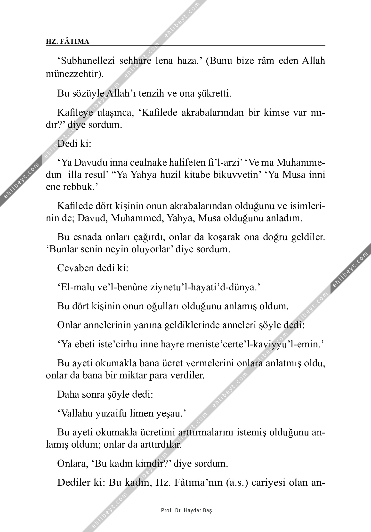 `Subhanellezi sehhare lena haza.' (Bunu bize râm eden Allah münezzehtir). Bu sözüyle Allah'ı tenzih ve ona şükretti. Kafileye ulaşınca, `Kafilede akrabalarından bir kimse var mıdır?' diye sordum. Dedi ki: `Ya Davudu inna cealnake halifeten fi'l-arzi' `Ve ma Muhammedun illa resul' "Ya Yahya huzil kitabe bikuvvetin' `Ya Musa inni ene rebbuk.' Kafilede dört kişinin onun akrabalarından olduğunu ve isimlerinin de; Davud, Muhammed, Yahya, Musa olduğunu anladım. Bu esnada onları çağırdı, onlar da koşarak ona doğru geldiler. `Bunlar senin neyin oluyorlar' diye sordum. Cevaben dedi ki: `El-malu ve'l-benûne ziynetu'l-hayati'd-dünya.' Bu dört kişinin onun oğulları olduğunu anlamış oldum. Onlar annelerinin yanına geldiklerinde anneleri şöyle dedi: `Ya ebeti iste'cirhu inne hayre meniste'certe'l-kaviyyu'l-emin.' Bu ayeti okumakla bana ücret vermelerini onlara anlatmış oldu, onlar da bana bir miktar para verdiler. Daha sonra şöyle dedi: `Vallahu yuzaifu limen yeşau.' Bu ayeti okumakla ücretimi arttırmalarını istemiş olduğunu anlamış oldum; onlar da arttırdılar. Onlara, `Bu […]
