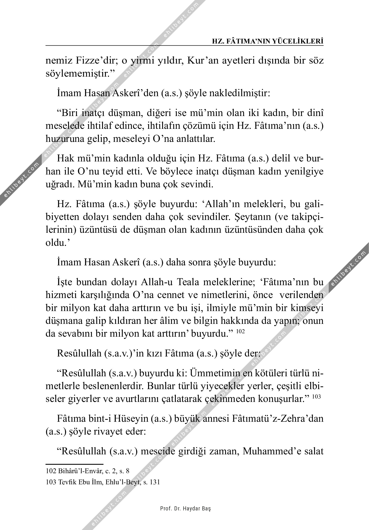 nemiz Fizze'dir; o yirmi yıldır, Kur'an ayetleri dışında bir söz söylememiştir." İmam Hasan Askerî'den (a.s.) şöyle nakledilmiştir: "Biri inatçı düşman, diğeri ise mü'min olan iki kadın, bir dinî meselede ihtilaf edince, ihtilafın çözümü için Hz. Fâtıma'nın (a.s.) huzuruna gelip, meseleyi O'na anlattılar. Hak mü'min kadınla olduğu için Hz. Fâtıma (a.s.) delil ve burhan ile O'nu teyid etti. Ve böylece inatçı düşman kadın yenilgiye uğradı. Mü'min kadın buna çok sevindi. Hz. Fâtıma (a.s.) şöyle buyurdu: `Allah'ın melekleri, bu galibiyetten dolayı senden daha çok sevindiler. Şeytanın (ve takipçilerinin) üzüntüsü de düşman olan kadının üzüntüsünden daha çok oldu.' İmam Hasan Askerî (a.s.) daha sonra şöyle buyurdu: İşte bundan dolayı Allah-u Teala meleklerine; `Fâtıma'nın bu hizmeti karşılığında O'na cennet ve nimetlerini, önce verilenden bir milyon kat daha arttırın ve bu işi, ilmiyle mü'min bir kimseyi düşmana galip kıldıran her âlim ve bilgin hakkında da yapın; onun da sevabını bir milyon kat […]