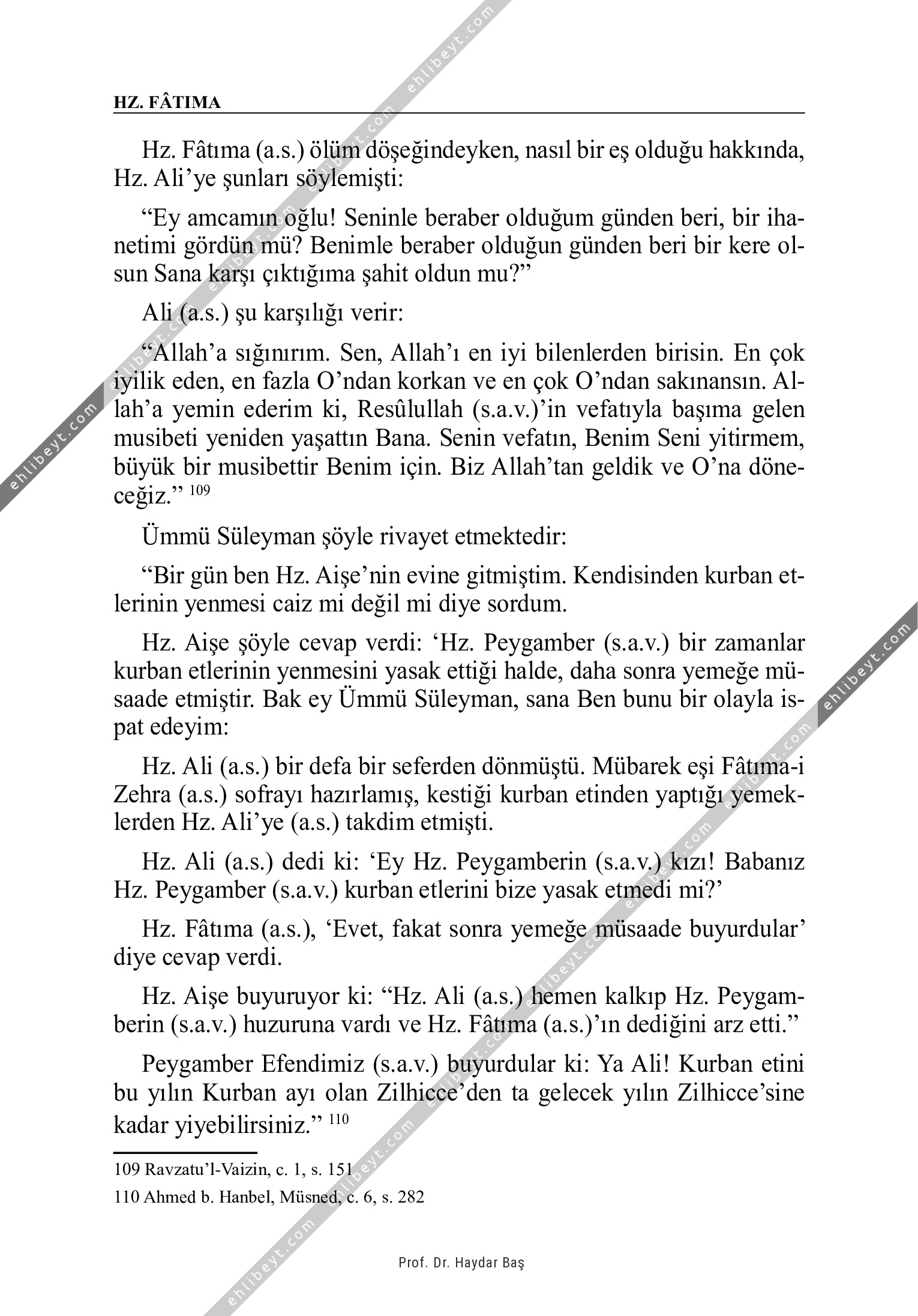 Hz. Fâtıma (a.s.) ölüm döşeğindeyken, nasıl bir eş olduğu hakkında, Hz. Ali'ye şunları söylemişti: "Ey amcamın oğlu! Seninle beraber olduğum günden beri, bir ihanetimi gördün mü? Benimle beraber olduğun günden beri bir kere olsun Sana karşı çıktığıma şahit oldun mu?" Ali (a.s.) şu karşılığı verir: "Allah'a sığınırım. Sen, Allah'ı en iyi bilenlerden birisin. En çok iyilik eden, en fazla O'ndan korkan ve en çok O'ndan sakınansın. Allah'a yemin ederim ki, Resûlullah (s.a.v.)'in vefatıyla başıma gelen musibeti yeniden yaşattın Bana. Senin vefatın, Benim Seni yitirmem, büyük bir musibettir Benim için. Biz Allah'tan geldik ve O'na döneceğiz." 109 Ümmü Süleyman şöyle rivayet etmektedir: "Bir gün ben Hz. Aişe'nin evine gitmiştim. Kendisinden kurban etlerinin yenmesi caiz mi değil mi diye sordum. Hz. Aişe şöyle cevap verdi: `Hz. Peygamber (s.a.v.) bir zamanlar kurban etlerinin yenmesini yasak ettiği halde, daha sonra yemeğe müsaade etmiştir. Bak ey Ümmü Süleyman, sana […]