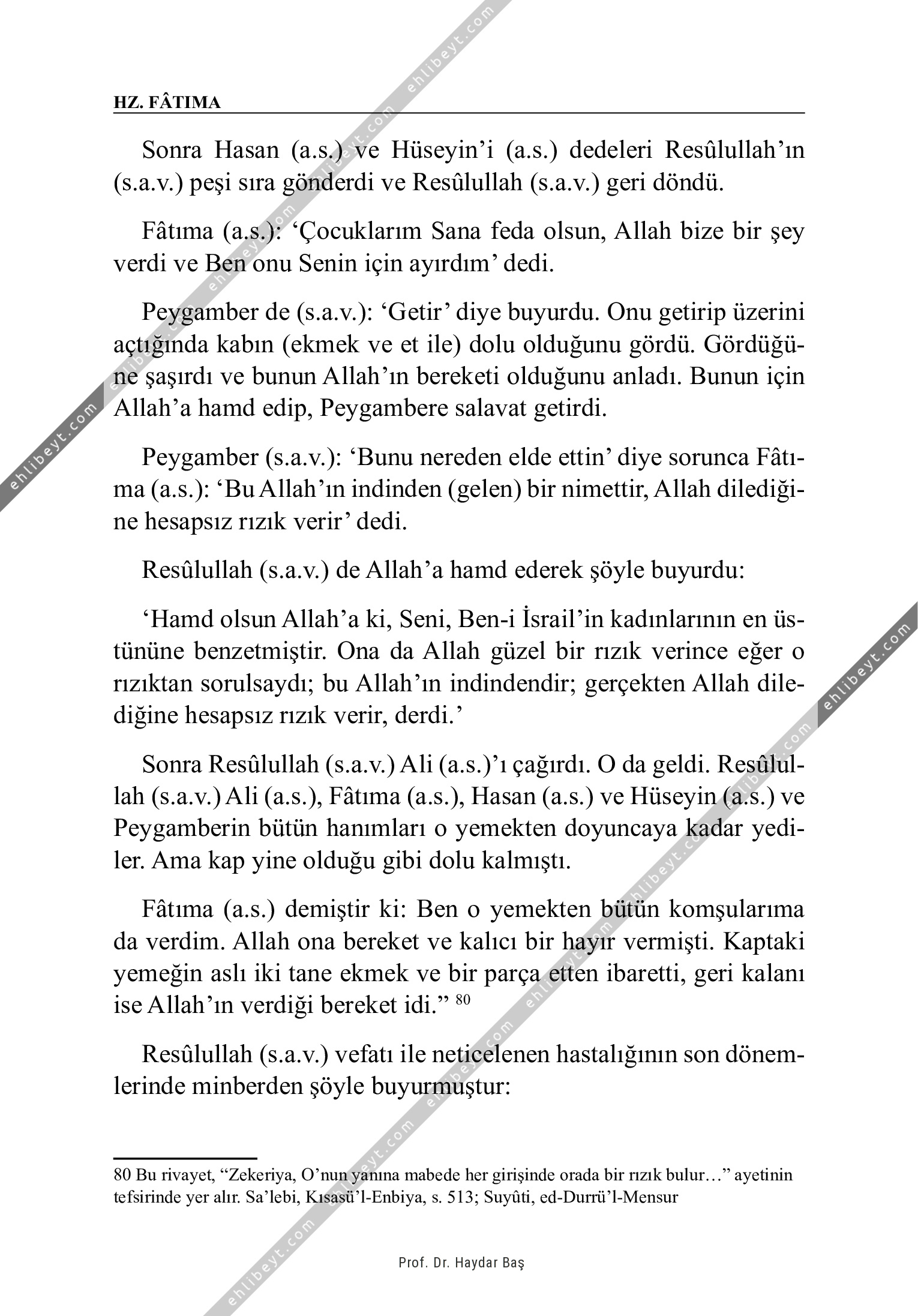 Sonra Hasan (a.s.) ve Hüseyin'i (a.s.) dedeleri Resûlullah'ın (s.a.v.) peşi sıra gönderdi ve Resûlullah (s.a.v.) geri döndü. Fâtıma (a.s.): `Çocuklarım Sana feda olsun, Allah bize bir şey verdi ve Ben onu Senin için ayırdım' dedi. Peygamber de (s.a.v.): `Getir' diye buyurdu. Onu getirip üzerini açtığında kabın (ekmek ve et ile) dolu olduğunu gördü. Gördüğüne şaşırdı ve bunun Allah'ın bereketi olduğunu anladı. Bunun için Allah'a hamd edip, Peygambere salavat getirdi. Peygamber (s.a.v.): `Bunu nereden elde ettin' diye sorunca Fâtıma (a.s.): `Bu Allah'ın indinden (gelen) bir nimettir, Allah dilediğine hesapsız rızık verir' dedi. Resûlullah (s.a.v.) de Allah'a hamd ederek şöyle buyurdu: `Hamd olsun Allah'a ki, Seni, Ben-i İsrail'in kadınlarının en üstününe benzetmiştir. Ona da Allah güzel bir rızık verince eğer o rızıktan sorulsaydı; bu Allah'ın indindendir; gerçekten Allah dilediğine hesapsız rızık verir, derdi.' Sonra Resûlullah (s.a.v.) Ali (a.s.)'ı çağırdı. O da geldi. Resûlullah (s.a.v.) Ali (a.s.), […]