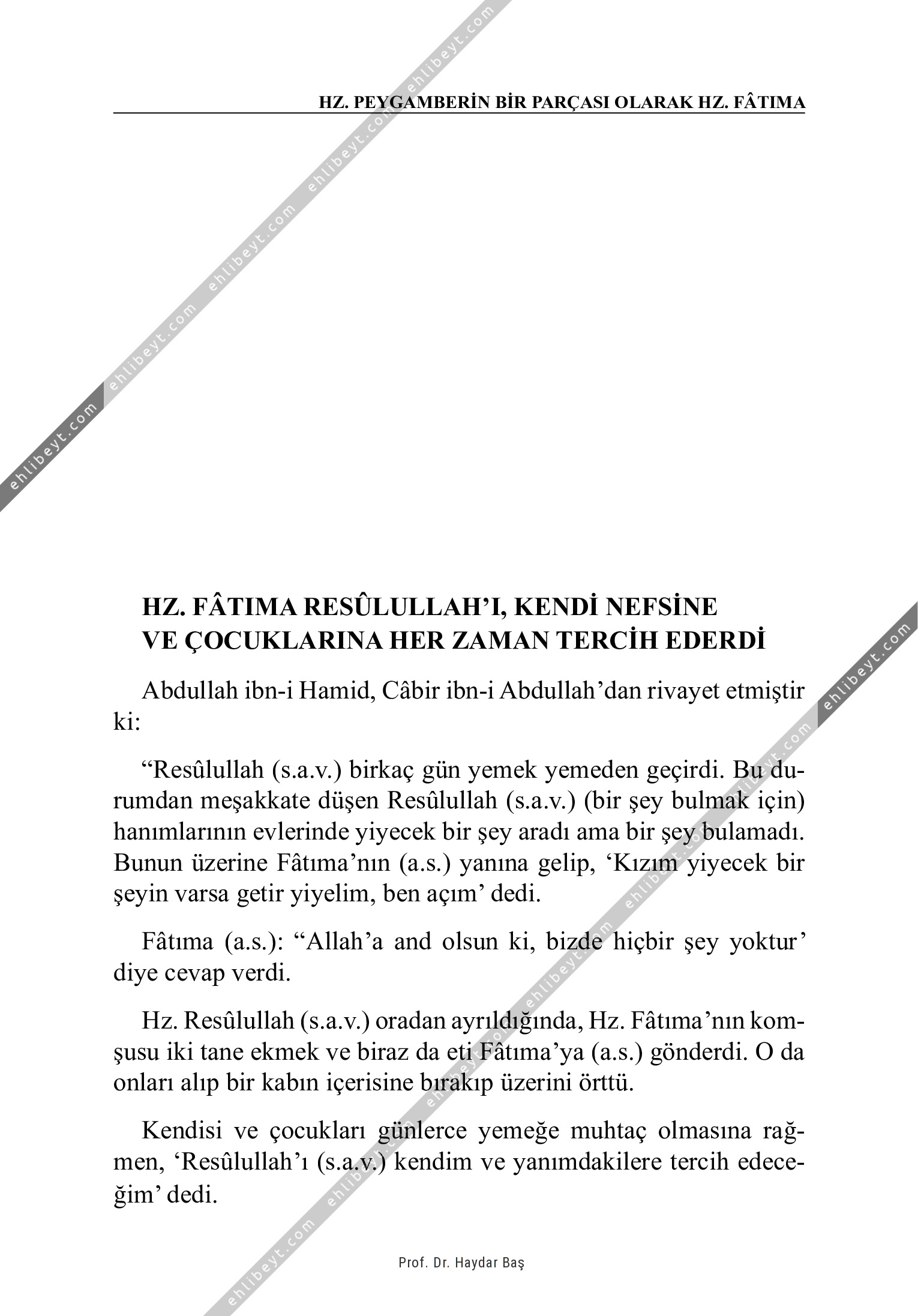 Abdullah ibn-i Hamid, Câbir ibn-i Abdullah'dan rivayet etmiştir ki: "Resûlullah (s.a.v.) birkaç gün yemek yemeden geçirdi. Bu durumdan meşakkate düşen Resûlullah (s.a.v.) (bir şey bulmak için) hanımlarının evlerinde yiyecek bir şey aradı ama bir şey bulamadı. Bunun üzerine Fâtıma'nın (a.s.) yanına gelip, `Kızım yiyecek bir şeyin varsa getir yiyelim, ben açım' dedi. Fâtıma (a.s.): "Allah'a and olsun ki, bizde hiçbir şey yoktur' diye cevap verdi. Hz. Resûlullah (s.a.v.) oradan ayrıldığında, Hz. Fâtıma'nın komşusu iki tane ekmek ve biraz da eti Fâtıma'ya (a.s.) gönderdi. O da onları alıp bir kabın içerisine bırakıp üzerini örttü. Kendisi ve çocukları günlerce yemeğe muhtaç olmasına rağmen, `Resûlullah'ı (s.a.v.) kendim ve yanımdakilere tercih edeceğim' dedi.