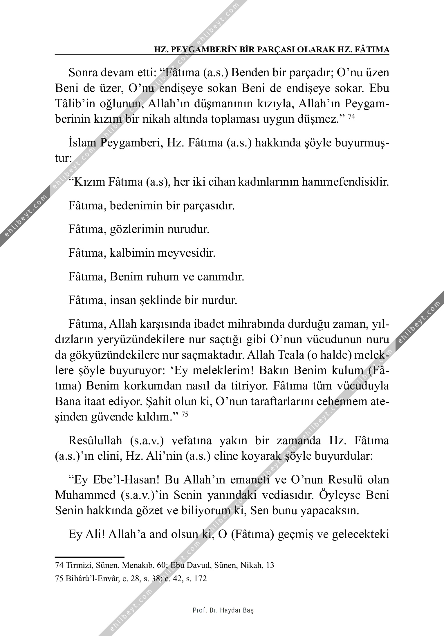 Sonra devam etti: "Fâtıma (a.s.) Benden bir parçadır; O'nu üzen Beni de üzer, O'nu endişeye sokan Beni de endişeye sokar. Ebu Tâlib'in oğlunun, Allah'ın düşmanının kızıyla, Allah'ın Peygamberinin kızını bir nikah altında toplaması uygun düşmez." 74 İslam Peygamberi, Hz. Fâtıma (a.s.) hakkında şöyle buyurmuştur: "Kızım Fâtıma (a.s), her iki cihan kadınlarının hanımefendisidir. Fâtıma, bedenimin bir parçasıdır. Fâtıma, gözlerimin nurudur. Fâtıma, kalbimin meyvesidir. Fâtıma, Benim ruhum ve canımdır. Fâtıma, insan şeklinde bir nurdur. Fâtıma, Allah karşısında ibadet mihrabında durduğu zaman, yıldızların yeryüzündekilere nur saçtığı gibi O'nun vücudunun nuru da gökyüzündekilere nur saçmaktadır. Allah Teala (o halde) meleklere şöyle buyuruyor: `Ey meleklerim! Bakın Benim kulum (Fâtıma) Benim korkumdan nasıl da titriyor. Fâtıma tüm vücuduyla Bana itaat ediyor. Şahit olun ki, O'nun taraftarlarını cehennem ateşinden güvende kıldım." 75 Resûlullah (s.a.v.) vefatına yakın bir zamanda Hz. Fâtıma (a.s.)'ın elini, Hz. Ali'nin (a.s.) eline koyarak şöyle buyurdular: "Ey Ebe'l-Hasan! […]
