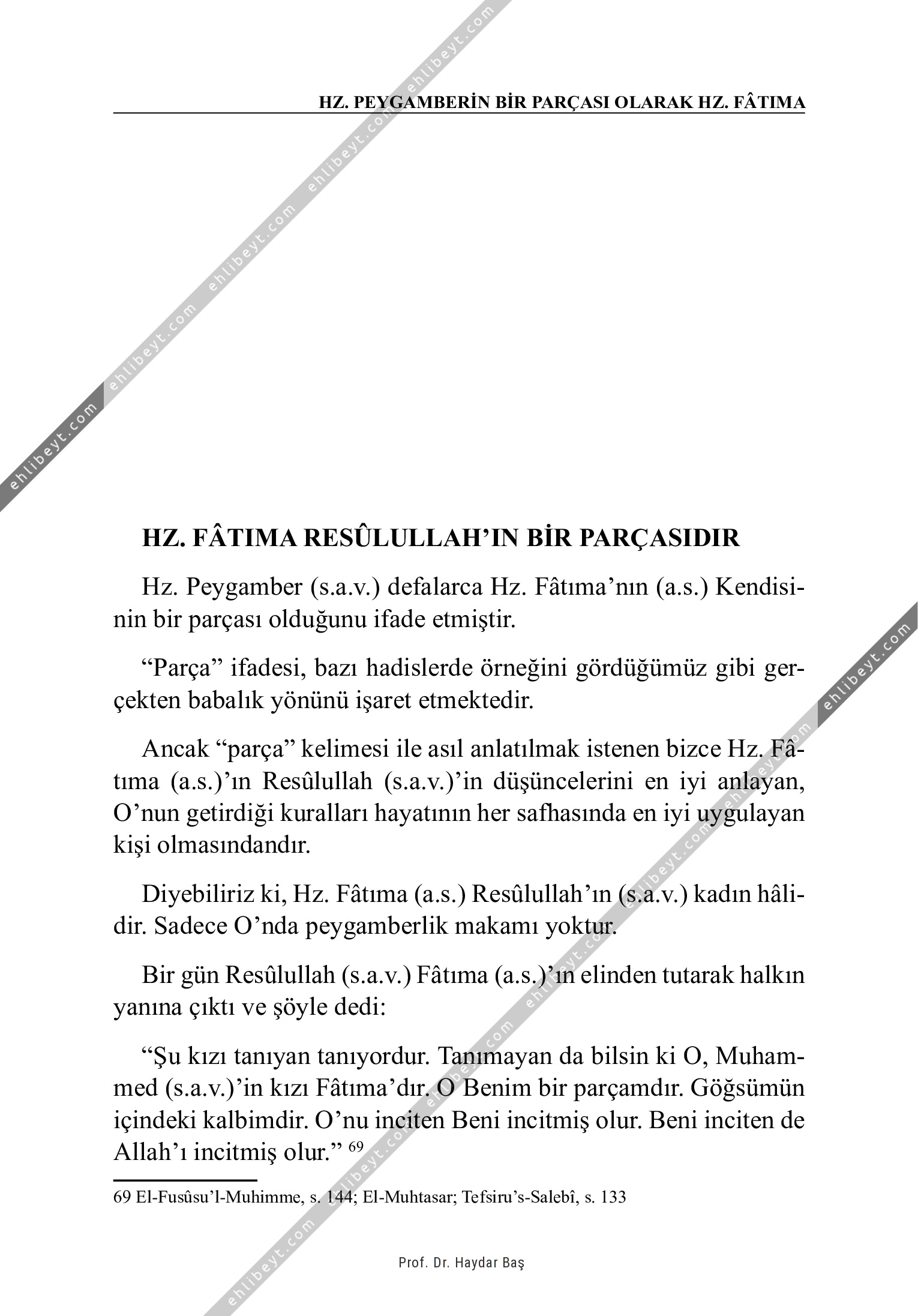 Hz. Peygamber (s.a.v.) defalarca Hz. Fâtıma'nın (a.s.) Kendisinin bir parçası olduğunu ifade etmiştir. "Parça" ifadesi, bazı hadislerde örneğini gördüğümüz gibi gerçekten babalık yönünü işaret etmektedir. Ancak "parça" kelimesi ile asıl anlatılmak istenen bizce Hz. Fâtıma (a.s.)'ın Resûlullah (s.a.v.)'in düşüncelerini en iyi anlayan, O'nun getirdiği kuralları hayatının her safhasında en iyi uygulayan kişi olmasındandır. Diyebiliriz ki, Hz. Fâtıma (a.s.) Resûlullah'ın (s.a.v.) kadın hâlidir. Sadece O'nda peygamberlik makamı yoktur. Bir gün Resûlullah (s.a.v.) Fâtıma (a.s.)'ın elinden tutarak halkın yanına çıktı ve şöyle dedi: "Şu kızı tanıyan tanıyordur. Tanımayan da bilsin ki O, Muhammed (s.a.v.)'in kızı Fâtıma'dır. O Benim bir parçamdır. Göğsümün içindeki kalbimdir. O'nu inciten Beni incitmiş olur. Beni inciten de Allah'ı incitmiş olur." 69 69 El-Fusûsu'l-Muhimme, s. 144; El-Muhtasar; Tefsiru's-Salebî, s. 133