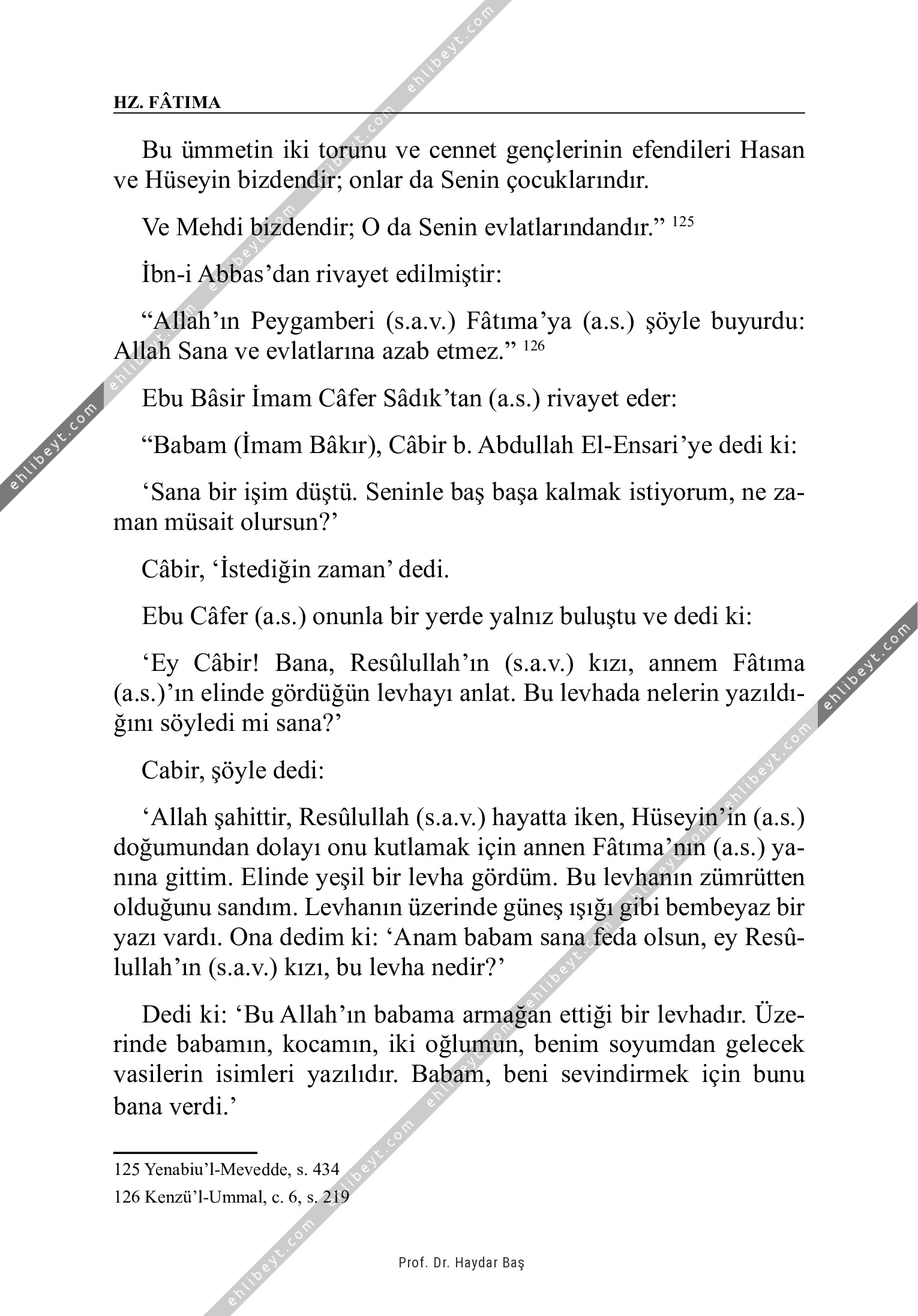 Bu ümmetin iki torunu ve cennet gençlerinin efendileri Hasan ve Hüseyin bizdendir; onlar da Senin çocuklarındır. Ve Mehdi bizdendir; O da Senin evlatlarındandır." 125 İbn-i Abbas'dan rivayet edilmiştir: "Allah'ın Peygamberi (s.a.v.) Fâtıma'ya (a.s.) şöyle buyurdu: Allah Sana ve evlatlarına azab etmez." 126 Ebu Bâsir İmam Câfer Sâdık'tan (a.s.) rivayet eder: "Babam (İmam Bâkır), Câbir b. Abdullah El-Ensari'ye dedi ki: `Sana bir işim düştü. Seninle baş başa kalmak istiyorum, ne zaman müsait olursun?' Câbir, `İstediğin zaman' dedi. Ebu Câfer (a.s.) onunla bir yerde yalnız buluştu ve dedi ki: `Ey Câbir! Bana, Resûlullah'ın (s.a.v.) kızı, annem Fâtıma (a.s.)'ın elinde gördüğün levhayı anlat. Bu levhada nelerin yazıldığını söyledi mi sana?' Cabir, şöyle dedi: `Allah şahittir, Resûlullah (s.a.v.) hayatta iken, Hüseyin'in (a.s.) doğumundan dolayı onu kutlamak için annen Fâtıma'nın (a.s.) yanına gittim. Elinde yeşil bir levha gördüm. Bu levhanın zümrütten olduğunu sandım. Levhanın üzerinde güneş ışığı gibi bembeyaz bir yazı vardı. […]