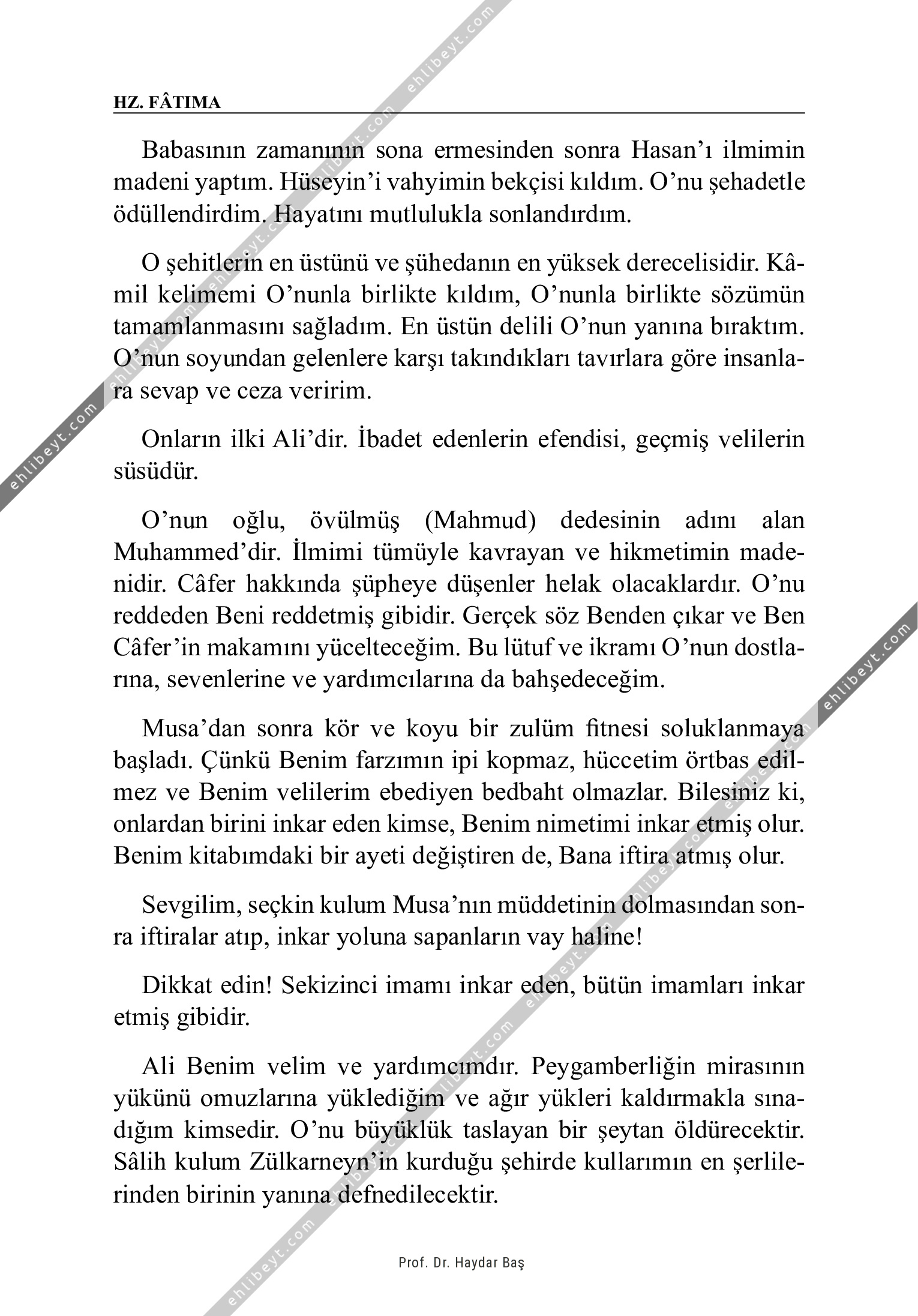 Babasının zamanının sona ermesinden sonra Hasan'ı ilmimin madeni yaptım. Hüseyin'i vahyimin bekçisi kıldım. O'nu şehadetle ödüllendirdim. Hayatını mutlulukla sonlandırdım. O şehitlerin en üstünü ve şühedanın en yüksek derecelisidir. Kâmil kelimemi O'nunla birlikte kıldım, O'nunla birlikte sözümün tamamlanmasını sağladım. En üstün delili O'nun yanına bıraktım. O'nun soyundan gelenlere karşı takındıkları tavırlara göre insanlara sevap ve ceza veririm. Onların ilki Ali'dir. İbadet edenlerin efendisi, geçmiş velilerin süsüdür. O'nun oğlu, övülmüş (Mahmud) dedesinin adını alan Muhammed'dir. İlmimi tümüyle kavrayan ve hikmetimin madenidir. Câfer hakkında şüpheye düşenler helak olacaklardır. O'nu reddeden Beni reddetmiş gibidir. Gerçek söz Benden çıkar ve Ben Câfer'in makamını yücelteceğim. Bu lütuf ve ikramı O'nun dostlarına, sevenlerine ve yardımcılarına da bahşedeceğim. Musa'dan sonra kör ve koyu bir zulüm fitnesi soluklanmaya başladı. Çünkü Benim farzımın ipi kopmaz, hüccetim örtbas edilmez ve Benim velilerim ebediyen bedbaht olmazlar. Bilesiniz ki, onlardan birini inkar eden kimse, Benim nimetimi inkar etmiş […]