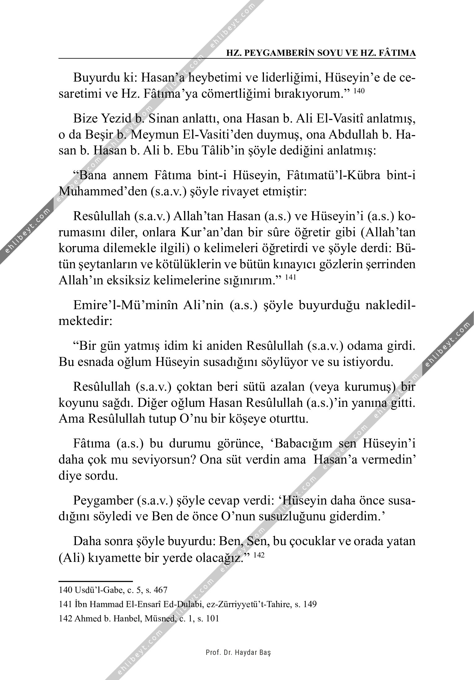 Buyurdu ki: Hasan'a heybetimi ve liderliğimi, Hüseyin'e de cesaretimi ve Hz. Fâtıma'ya cömertliğimi bırakıyorum." 140 Bize Yezid b. Sinan anlattı, ona Hasan b. Ali El-Vasitî anlatmış, o da Beşir b. Meymun El-Vasiti'den duymuş, ona Abdullah b. Hasan b. Hasan b. Ali b. Ebu Tâlib'in şöyle dediğini anlatmış: "Bana annem Fâtıma bint-i Hüseyin, Fâtımatü'l-Kübra bint-i Muhammed'den (s.a.v.) şöyle rivayet etmiştir: Resûlullah (s.a.v.) Allah'tan Hasan (a.s.) ve Hüseyin'i (a.s.) korumasını diler, onlara Kur'an'dan bir sûre öğretir gibi (Allah'tan koruma dilemekle ilgili) o kelimeleri öğretirdi ve şöyle derdi: Bütün şeytanların ve kötülüklerin ve bütün kınayıcı gözlerin şerrinden Allah'ın eksiksiz kelimelerine sığınırım." 141 Emire'l-Mü'minîn Ali'nin (a.s.) şöyle buyurduğu nakledilmektedir: "Bir gün yatmış idim ki aniden Resûlullah (s.a.v.) odama girdi. Bu esnada oğlum Hüseyin susadığını söylüyor ve su istiyordu. Resûlullah (s.a.v.) çoktan beri sütü azalan (veya kurumuş) bir koyunu sağdı. Diğer oğlum Hasan Resûlullah (a.s.)'in yanına gitti. Ama Resûlullah tutup […]