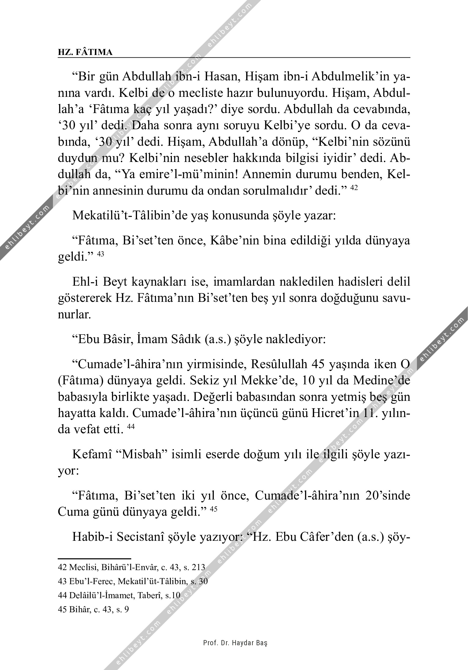 "Bir gün Abdullah ibn-i Hasan, Hişam ibn-i Abdulmelik'in yanına vardı. Kelbi de o mecliste hazır bulunuyordu. Hişam, Abdullah'a `Fâtıma kaç yıl yaşadı?' diye sordu. Abdullah da cevabında, `30 yıl' dedi. Daha sonra aynı soruyu Kelbi'ye sordu. O da cevabında, `30 yıl' dedi. Hişam, Abdullah'a dönüp, "Kelbi'nin sözünü duydun mu? Kelbi'nin nesebler hakkında bilgisi iyidir' dedi. Abdullah da, "Ya emire'l-mü'minin! Annemin durumu benden, Kelbi'nin annesinin durumu da ondan sorulmalıdır' dedi." 42 Mekatilü't-Tâlibin'de yaş konusunda şöyle yazar: "Fâtıma, Bi'set'ten önce, Kâbe'nin bina edildiği yılda dünyaya geldi." 43 Ehl-i Beyt kaynakları ise, imamlardan nakledilen hadisleri delil göstererek Hz. Fâtıma'nın Bi'set'ten beş yıl sonra doğduğunu savunurlar. "Ebu Bâsir, İmam Sâdık (a.s.) şöyle naklediyor: "Cumade'l-âhira'nın yirmisinde, Resûlullah 45 yaşında iken O (Fâtıma) dünyaya geldi. Sekiz yıl Mekke'de, 10 yıl da Medine'de babasıyla birlikte yaşadı. Değerli babasından sonra yetmiş beş gün hayatta kaldı. Cumade'l-âhira'nın üçüncü günü Hicret'in 11. yılında […]