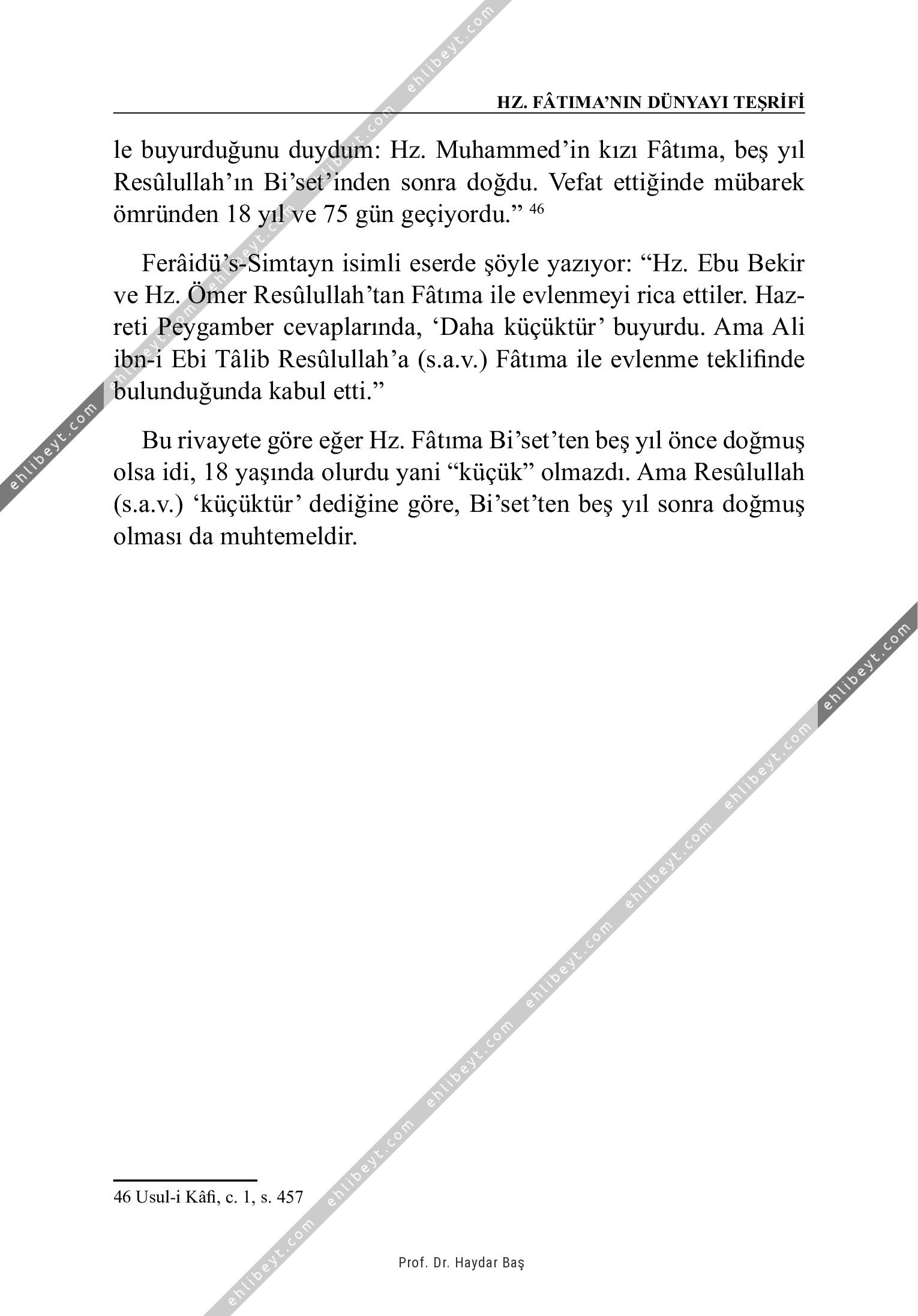 le buyurduğunu duydum: Hz. Muhammed'in kızı Fâtıma, beş yıl Resûlullah'ın Bi'set'inden sonra doğdu. Vefat ettiğinde mübarek ömründen 18 yıl ve 75 gün geçiyordu." 46 Ferâidü's-Simtayn isimli eserde şöyle yazıyor: "Hz. Ebu Bekir ve Hz. Ömer Resûlullah'tan Fâtıma ile evlenmeyi rica ettiler. Hazreti Peygamber cevaplarında, `Daha küçüktür' buyurdu. Ama Ali ibn-i Ebi Tâlib Resûlullah'a (s.a.v.) Fâtıma ile evlenme teklifinde bulunduğunda kabul etti." Bu rivayete göre eğer Hz. Fâtıma Bi'set'ten beş yıl önce doğmuş olsa idi, 18 yaşında olurdu yani "küçük" olmazdı. Ama Resûlullah (s.a.v.) `küçüktür' dediğine göre, Bi'set'ten beş yıl sonra doğmuş olması da muhtemeldir. 46 Usul-i Kâfi, c. 1, s. 457