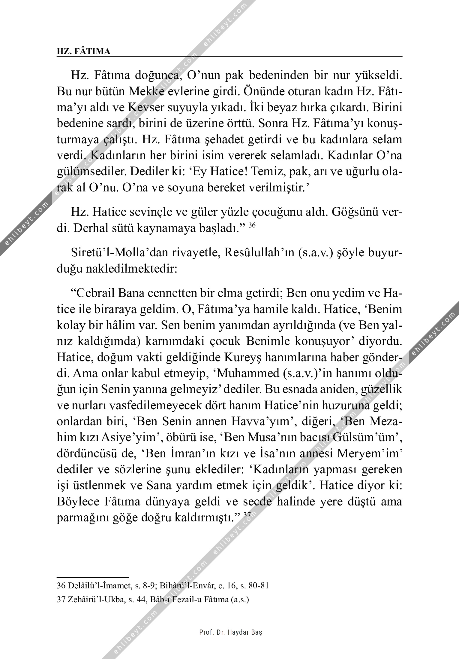 Hz. Fâtıma doğunca, O'nun pak bedeninden bir nur yükseldi. Bu nur bütün Mekke evlerine girdi. Önünde oturan kadın Hz. Fâtıma'yı aldı ve Kevser suyuyla yıkadı. İki beyaz hırka çıkardı. Birini bedenine sardı, birini de üzerine örttü. Sonra Hz. Fâtıma'yı konuşturmaya çalıştı. Hz. Fâtıma şehadet getirdi ve bu kadınlara selam verdi. Kadınların her birini isim vererek selamladı. Kadınlar O'na gülümsediler. Dediler ki: `Ey Hatice! Temiz, pak, arı ve uğurlu olarak al O'nu. O'na ve soyuna bereket verilmiştir.' Hz. Hatice sevinçle ve güler yüzle çocuğunu aldı. Göğsünü verdi. Derhal sütü kaynamaya başladı." 36 Siretü'l-Molla'dan rivayetle, Resûlullah'ın (s.a.v.) şöyle buyurduğu nakledilmektedir: "Cebrail Bana cennetten bir elma getirdi; Ben onu yedim ve Hatice ile biraraya geldim. O, Fâtıma'ya hamile kaldı. Hatice, `Benim kolay bir hâlim var. Sen benim yanımdan ayrıldığında (ve Ben yalnız kaldığımda) karnımdaki çocuk Benimle konuşuyor' diyordu. Hatice, doğum vakti geldiğinde Kureyş hanımlarına haber gönder[…]