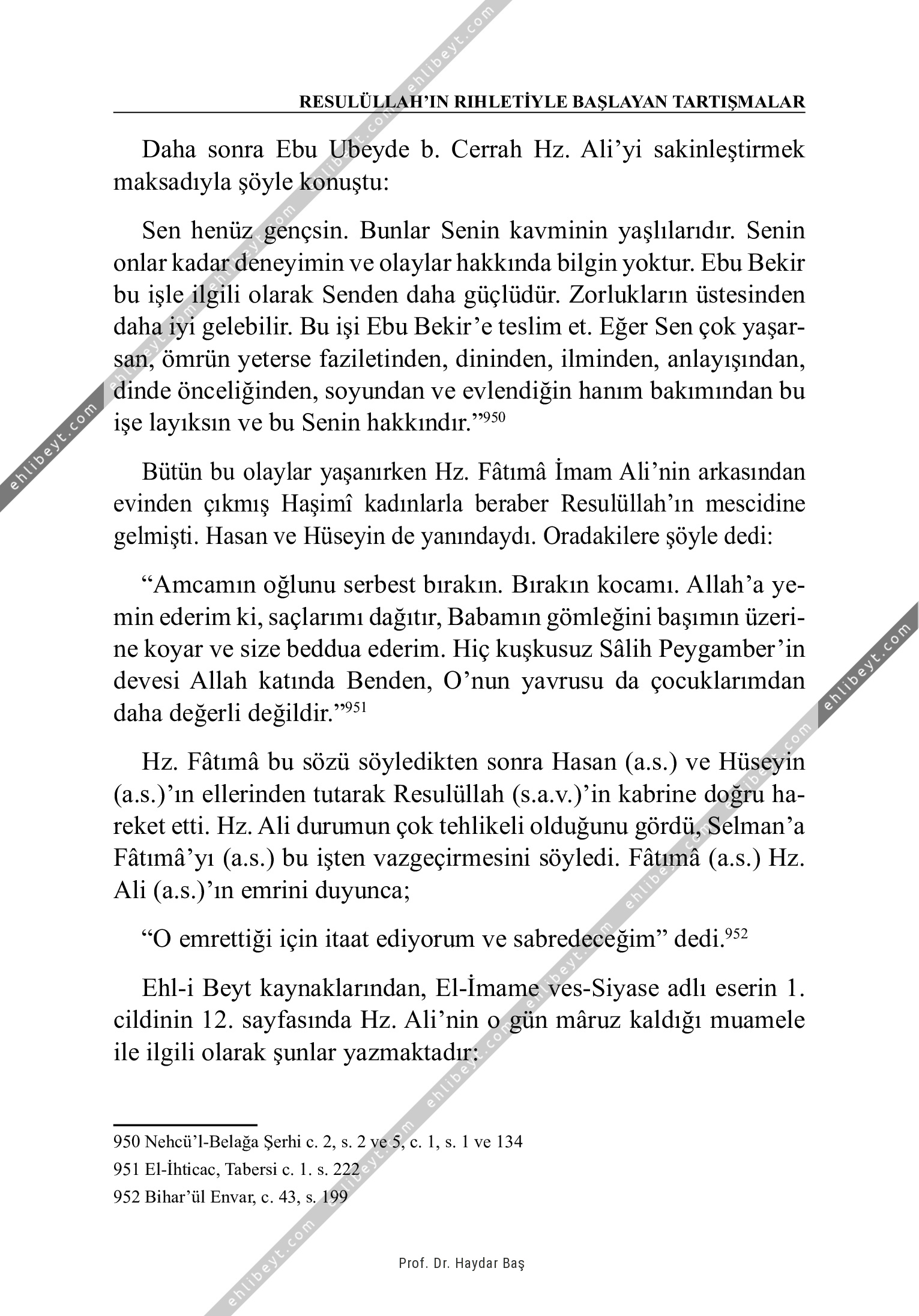 Daha sonra Ebu Ubeyde b. Cerrah Hz. Ali'yi sakinleştirmek maksadıyla şöyle konuştu: Sen henüz gençsin. Bunlar Senin kavminin yaşlılarıdır. Senin onlar kadar deneyimin ve olaylar hakkında bilgin yoktur. Ebu Bekir bu işle ilgili olarak Senden daha güçlüdür. Zorlukların üstesinden daha iyi gelebilir. Bu işi Ebu Bekir'e teslim et. Eğer Sen çok yaşarsan, ömrün yeterse faziletinden, dininden, ilminden, anlayışından, dinde önceliğinden, soyundan ve evlendiğin hanım bakımından bu işe layıksın ve bu Senin hakkındır."950 Bütün bu olaylar yaşanırken Hz. Fâtımâ İmam Ali'nin arkasından evinden çıkmış Haşimî kadınlarla beraber Resulüllah'ın mescidine gelmişti. Hasan ve Hüseyin de yanındaydı. Oradakilere şöyle dedi: "Amcamın oğlunu serbest bırakın. Bırakın kocamı. Allah'a yemin ederim ki, saçlarımı dağıtır, Babamın gömleğini başımın üzerine koyar ve size beddua ederim. Hiç kuşkusuz Sâlih Peygamber'in devesi Allah katında Benden, O'nun yavrusu da çocuklarımdan daha değerli değildir."951 Hz. Fâtımâ bu sözü söyledikten sonra Hasan (a.s.) ve Hüseyin (a.s.)'ın ellerinden tutarak Resulüllah […]