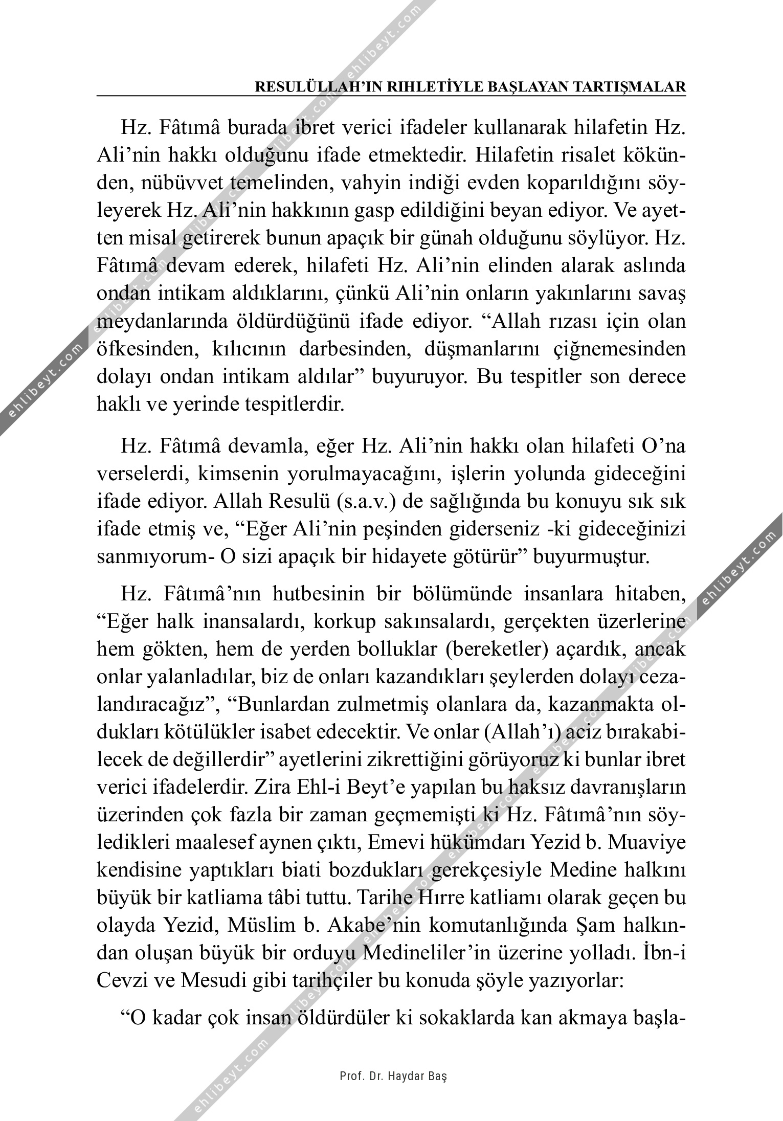 Hz. Fâtımâ burada ibret verici ifadeler kullanarak hilafetin Hz. Ali'nin hakkı olduğunu ifade etmektedir. Hilafetin risalet kökünden, nübüvvet temelinden, vahyin indiği evden koparıldığını söyleyerek Hz. Ali'nin hakkının gasp edildiğini beyan ediyor. Ve ayetten misal getirerek bunun apaçık bir günah olduğunu söylüyor. Hz. Fâtımâ devam ederek, hilafeti Hz. Ali'nin elinden alarak aslında ondan intikam aldıklarını, çünkü Ali'nin onların yakınlarını savaş meydanlarında öldürdüğünü ifade ediyor. "Allah rızası için olan öfkesinden, kılıcının darbesinden, düşmanlarını çiğnemesinden dolayı ondan intikam aldılar" buyuruyor. Bu tespitler son derece haklı ve yerinde tespitlerdir. Hz. Fâtımâ devamla, eğer Hz. Ali'nin hakkı olan hilafeti O'na verselerdi, kimsenin yorulmayacağını, işlerin yolunda gideceğini ifade ediyor. Allah Resulü (s.a.v.) de sağlığında bu konuyu sık sık ifade etmiş ve, "Eğer Ali'nin peşinden giderseniz -ki gideceğinizi sanmıyorumO sizi apaçık bir hidayete götürür" buyurmuştur. Hz. Fâtımâ'nın hutbesinin bir bölümünde insanlara hitaben, "Eğer halk inansalardı, korkup sakınsalardı, gerçekten üzerlerine hem gökten, hem de […]