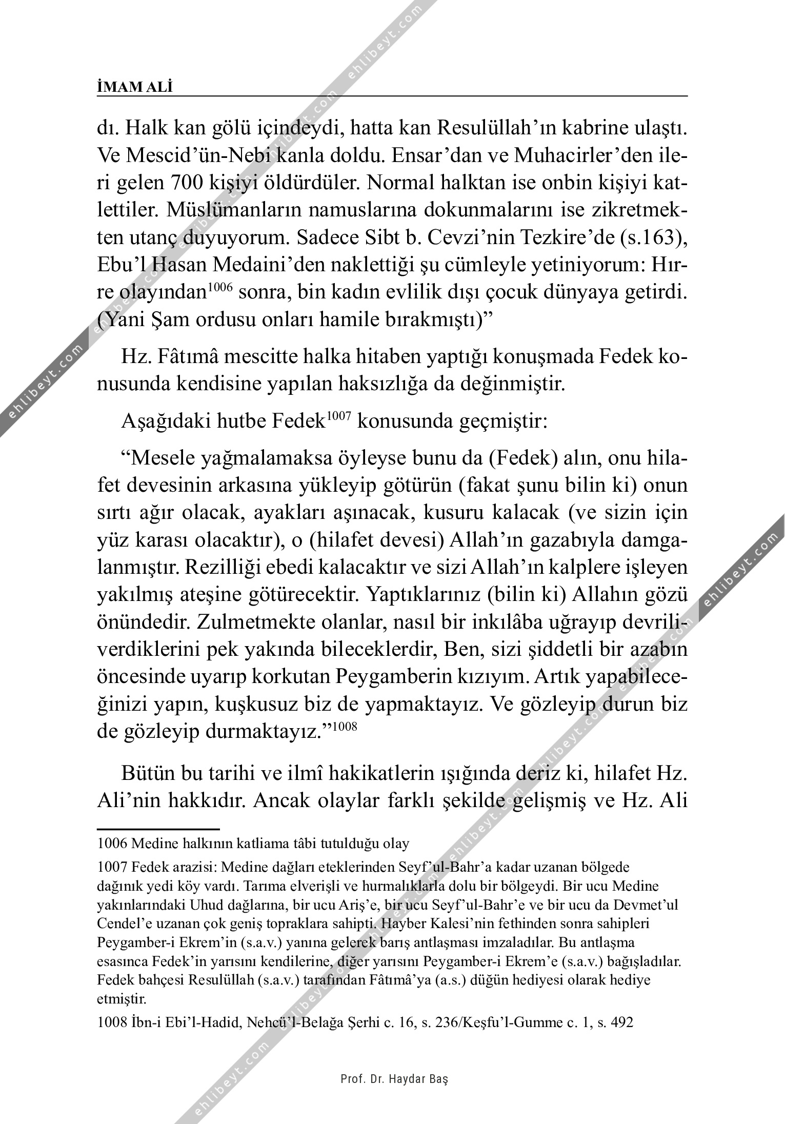dı. Halk kan gölü içindeydi, hatta kan Resulüllah'ın kabrine ulaştı. Ve Mescid'ün-Nebi kanla doldu. Ensar'dan ve Muhacirler'den ileri gelen 700 kişiyi öldürdüler. Normal halktan ise onbin kişiyi katlettiler. Müslümanların namuslarına dokunmalarını ise zikretmekten utanç duyuyorum. Sadece Sibt b. Cevzi'nin Tezkire'de (s.163), Ebu'l Hasan Medaini'den naklettiği şu cümleyle yetiniyorum: Hırre olayından1006 sonra, bin kadın evlilik dışı çocuk dünyaya getirdi. (Yani Şam ordusu onları hamile bırakmıştı)" Hz. Fâtımâ mescitte halka hitaben yaptığı konuşmada Fedek konusunda kendisine yapılan haksızlığa da değinmiştir. Aşağıdaki hutbe Fedek1007 konusunda geçmiştir: "Mesele yağmalamaksa öyleyse bunu da (Fedek) alın, onu hilafet devesinin arkasına yükleyip götürün (fakat şunu bilin ki) onun sırtı ağır olacak, ayakları aşınacak, kusuru kalacak (ve sizin için yüz karası olacaktır), o (hilafet devesi) Allah'ın gazabıyla damgalanmıştır. Rezilliği ebedi kalacaktır ve sizi Allah'ın kalplere işleyen yakılmış ateşine götürecektir. Yaptıklarınız (bilin ki) Allahın gözü önündedir. Zulmetmekte olanlar, nasıl bir inkılâba uğrayıp […]