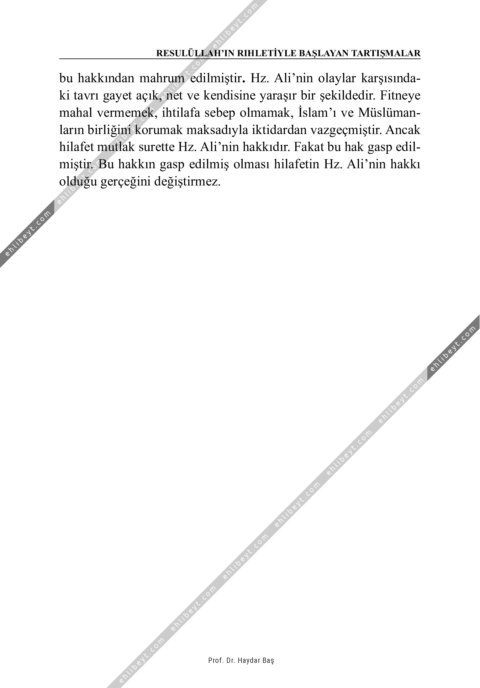bu hakkından mahrum edilmiştir. Hz. Ali'nin olaylar karşısındaki tavrı gayet açık, net ve kendisine yaraşır bir şekildedir. Fitneye mahal vermemek, ihtilafa sebep olmamak, İslam'ı ve Müslümanların birliğini korumak maksadıyla iktidardan vazgeçmiştir. Ancak hilafet mutlak surette Hz. Ali'nin hakkıdır. Fakat bu hak gasp edilmiştir. Bu hakkın gasp edilmiş olması hilafetin Hz. Ali'nin hakkı olduğu gerçeğini değiştirmez.