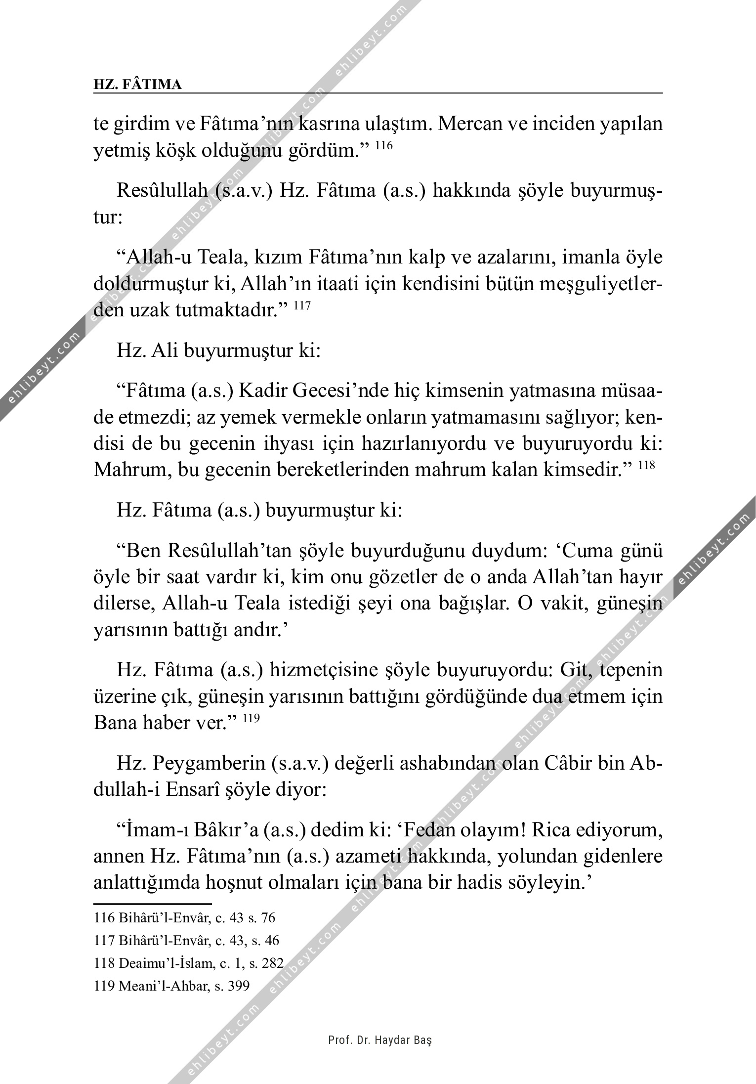 te girdim ve Fâtıma'nın kasrına ulaştım. Mercan ve inciden yapılan yetmiş köşk olduğunu gördüm." 116 Resûlullah (s.a.v.) Hz. Fâtıma (a.s.) hakkında şöyle buyurmuştur: "Allah-u Teala, kızım Fâtıma'nın kalp ve azalarını, imanla öyle doldurmuştur ki, Allah'ın itaati için kendisini bütün meşguliyetlerden uzak tutmaktadır." 117 Hz. Ali buyurmuştur ki: "Fâtıma (a.s.) Kadir Gecesi'nde hiç kimsenin yatmasına müsaade etmezdi; az yemek vermekle onların yatmamasını sağlıyor; kendisi de bu gecenin ihyası için hazırlanıyordu ve buyuruyordu ki: Mahrum, bu gecenin bereketlerinden mahrum kalan kimsedir." 118 Hz. Fâtıma (a.s.) buyurmuştur ki: "Ben Resûlullah'tan şöyle buyurduğunu duydum: `Cuma günü öyle bir saat vardır ki, kim onu gözetler de o anda Allah'tan hayır dilerse, Allah-u Teala istediği şeyi ona bağışlar. O vakit, güneşin yarısının battığı andır.' Hz. Fâtıma (a.s.) hizmetçisine şöyle buyuruyordu: Git, tepenin üzerine çık, güneşin yarısının battığını gördüğünde dua etmem için Bana haber ver." 119 Hz. Peygamberin (s.a.v.) değerli ashabından olan Câbir […]