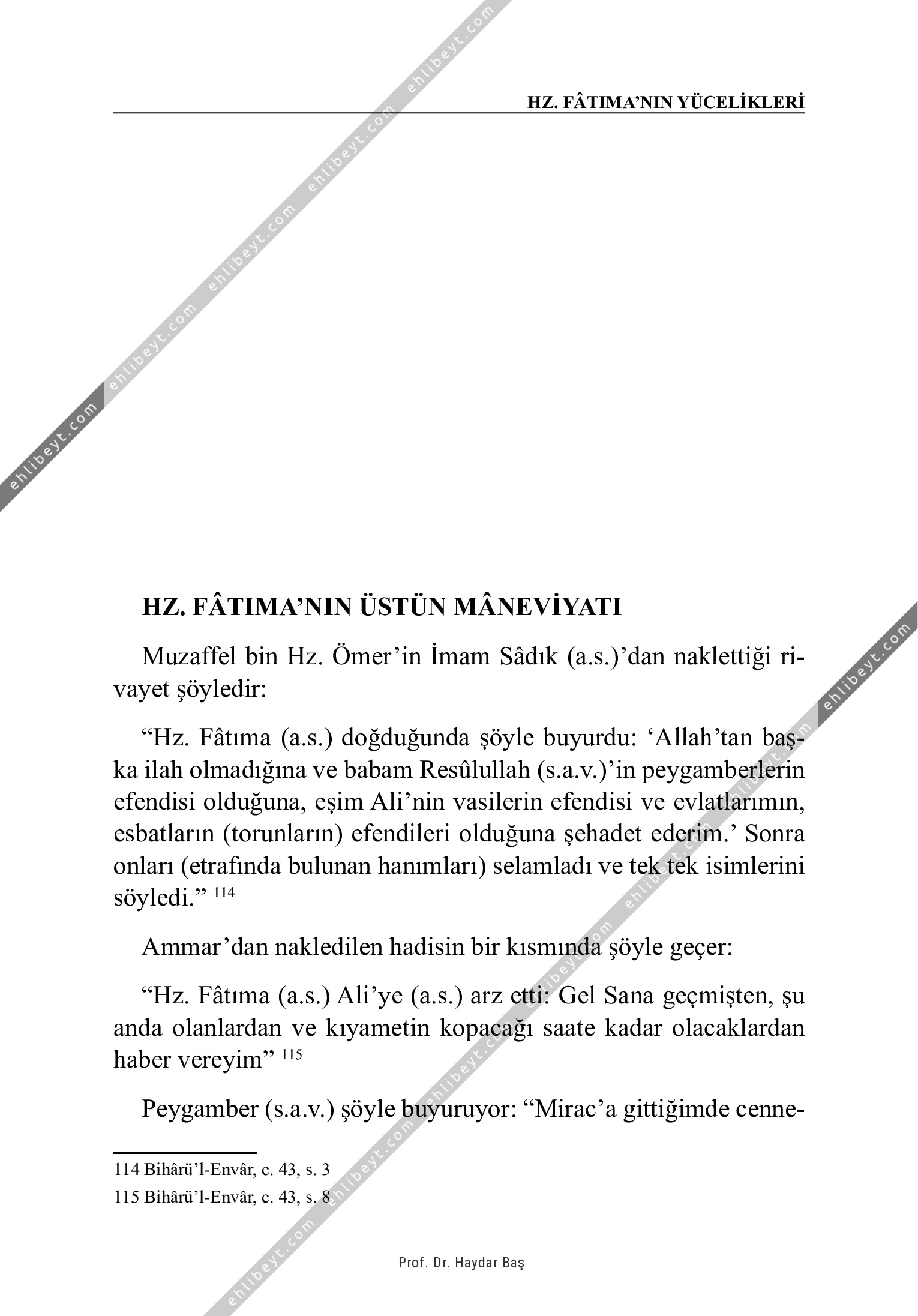 Muzaffel bin Hz. Ömer'in İmam Sâdık (a.s.)'dan naklettiği rivayet şöyledir: "Hz. Fâtıma (a.s.) doğduğunda şöyle buyurdu: `Allah'tan başka ilah olmadığına ve babam Resûlullah (s.a.v.)'in peygamberlerin efendisi olduğuna, eşim Ali'nin vasilerin efendisi ve evlatlarımın, esbatların (torunların) efendileri olduğuna şehadet ederim.' Sonra onları (etrafında bulunan hanımları) selamladı ve tek tek isimlerini söyledi." 114 Ammar'dan nakledilen hadisin bir kısmında şöyle geçer: "Hz. Fâtıma (a.s.) Ali'ye (a.s.) arz etti: Gel Sana geçmişten, şu anda olanlardan ve kıyametin kopacağı saate kadar olacaklardan haber vereyim" 115 Peygamber (s.a.v.) şöyle buyuruyor: "Mirac'a gittiğimde cenne114 Bihârü'l-Envâr, c. 43, s. 3 115 Bihârü'l-Envâr, c. 43, s. 8