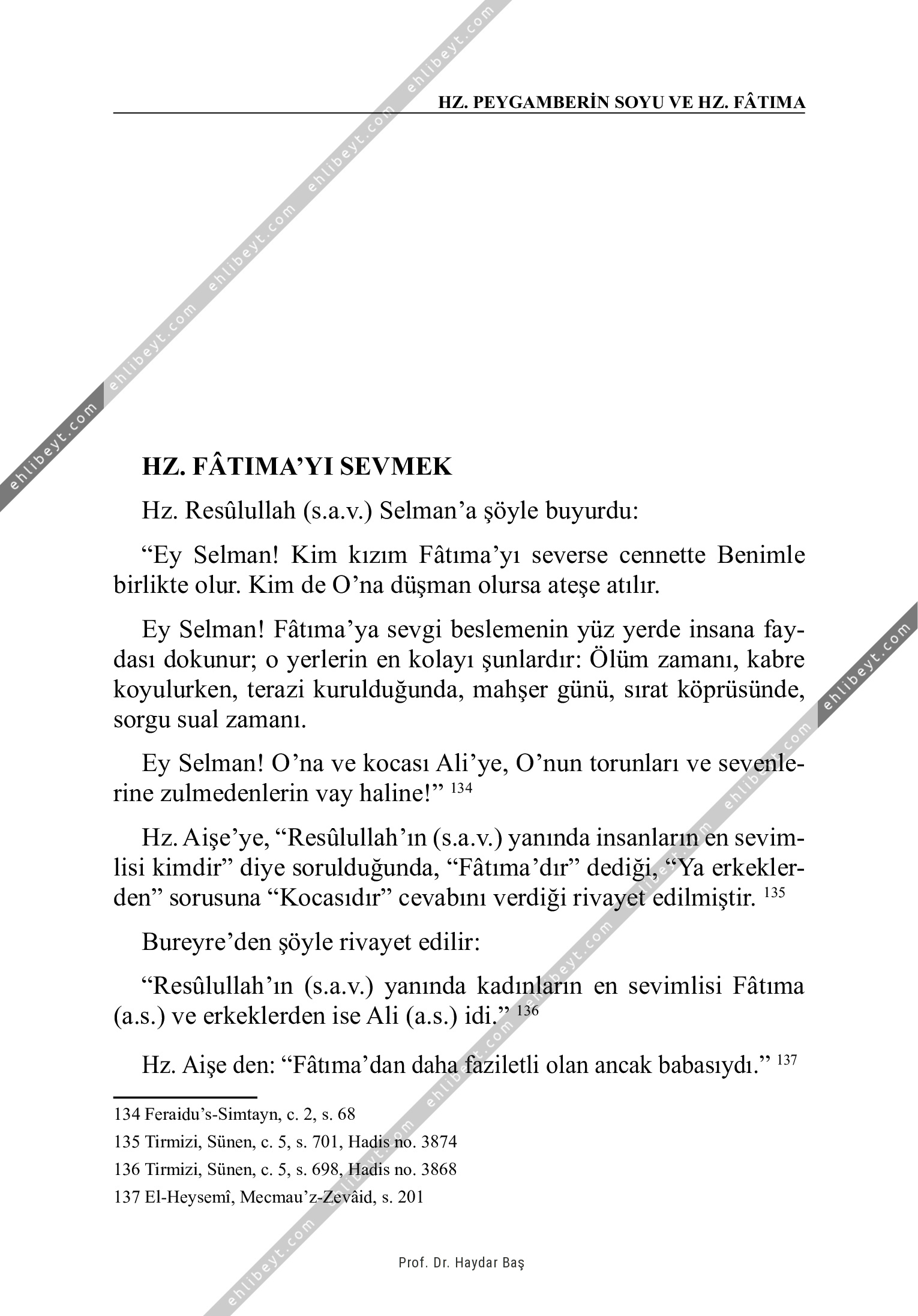 Hz. Resûlullah (s.a.v.) Selman'a şöyle buyurdu: "Ey Selman! Kim kızım Fâtıma'yı severse cennette Benimle birlikte olur. Kim de O'na düşman olursa ateşe atılır. Ey Selman! Fâtıma'ya sevgi beslemenin yüz yerde insana faydası dokunur; o yerlerin en kolayı şunlardır: Ölüm zamanı, kabre koyulurken, terazi kurulduğunda, mahşer günü, sırat köprüsünde, sorgu sual zamanı. Ey Selman! O'na ve kocası Ali'ye, O'nun torunları ve sevenlerine zulmedenlerin vay haline!" 134 Hz. Aişe'ye, "Resûlullah'ın (s.a.v.) yanında insanların en sevimlisi kimdir" diye sorulduğunda, "Fâtıma'dır" dediği, "Ya erkeklerden" sorusuna "Kocasıdır" cevabını verdiği rivayet edilmiştir. 135 Bureyre'den şöyle rivayet edilir: "Resûlullah'ın (s.a.v.) yanında kadınların en sevimlisi Fâtıma (a.s.) ve erkeklerden ise Ali (a.s.) idi." 136 Hz. Aişe den: "Fâtıma'dan daha faziletli olan ancak babasıydı." 137 134 Feraidu's-Simtayn, c. 2, s. 68 135 Tirmizi, Sünen, c. 5, s. 701, Hadis no. 3874 136 Tirmizi, Sünen, c. 5, s. 698, Hadis no. 3868 137 El-Heysemî, Mecmau'z-Zevâid, s. […]