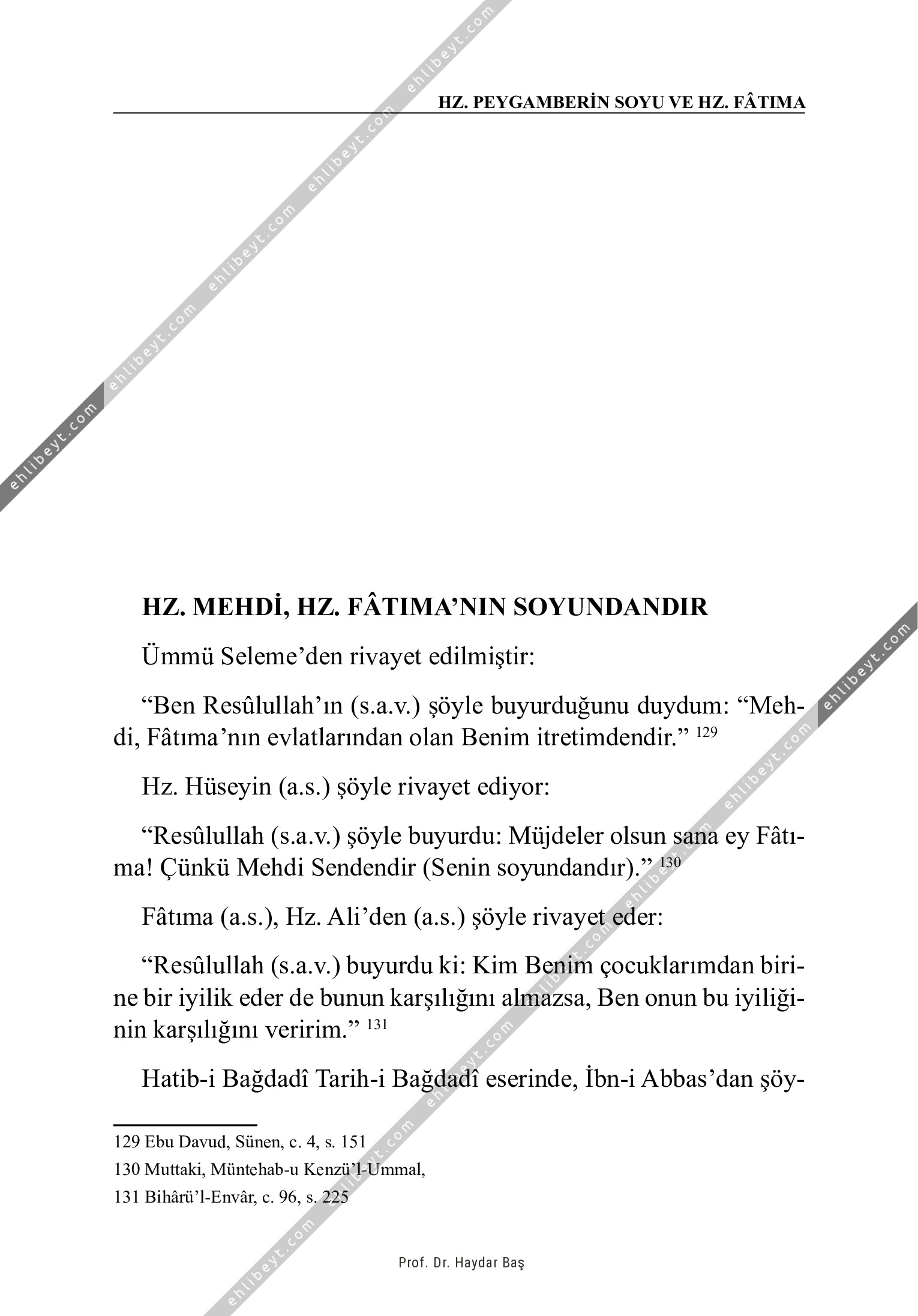 Ümmü Seleme'den rivayet edilmiştir: "Ben Resûlullah'ın (s.a.v.) şöyle buyurduğunu duydum: "Mehdi, Fâtıma'nın evlatlarından olan Benim itretimdendir." 129 Hz. Hüseyin (a.s.) şöyle rivayet ediyor: "Resûlullah (s.a.v.) şöyle buyurdu: Müjdeler olsun sana ey Fâtıma! Çünkü Mehdi Sendendir (Senin soyundandır)." 130 Fâtıma (a.s.), Hz. Ali'den (a.s.) şöyle rivayet eder: "Resûlullah (s.a.v.) buyurdu ki: Kim Benim çocuklarımdan birine bir iyilik eder de bunun karşılığını almazsa, Ben onun bu iyiliğinin karşılığını veririm." 131 Hatib-i Bağdadî Tarih-i Bağdadî eserinde, İbn-i Abbas'dan şöy129 Ebu Davud, Sünen, c. 4, s. 151 130 Muttaki, Müntehab-u Kenzü'l-Ummal, 131 Bihârü'l-Envâr, c. 96, s. 225