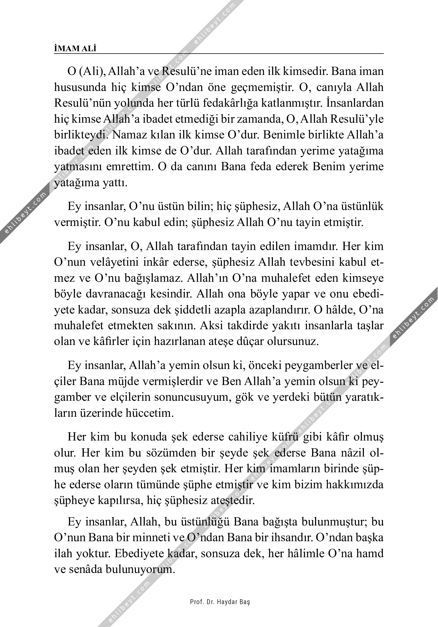 O (Ali), Allah'a ve Resulü'ne iman eden ilk kimsedir. Bana iman hususunda hiç kimse O'ndan öne geçmemiştir. O, canıyla Allah Resulü'nün yolunda her türlü fedakârlığa katlanmıştır. İnsanlardan hiç kimse Allah'a ibadet etmediği bir zamanda, O, Allah Resulü'yle birlikteydi. Namaz kılan ilk kimse O'dur. Benimle birlikte Allah'a ibadet eden ilk kimse de O'dur. Allah tarafından yerime yatağıma yatmasını emrettim. O da canını Bana feda ederek Benim yerime yatağıma yattı. Ey insanlar, O'nu üstün bilin; hiç şüphesiz, Allah O'na üstünlük vermiştir. O'nu kabul edin; şüphesiz Allah O'nu tayin etmiştir. Ey insanlar, O, Allah tarafından tayin edilen imamdır. Her kim O'nun velâyetini inkâr ederse, şüphesiz Allah tevbesini kabul etmez ve O'nu bağışlamaz. Allah'ın O'na muhalefet eden kimseye böyle davranacağı kesindir. Allah ona böyle yapar ve onu ebediyete kadar, sonsuza dek şiddetli azapla azaplandırır. O hâlde, O'na muhalefet etmekten sakının. Aksi takdirde yakıtı insanlarla taşlar olan ve kâfirler için hazırlanan ateşe dûçar […]