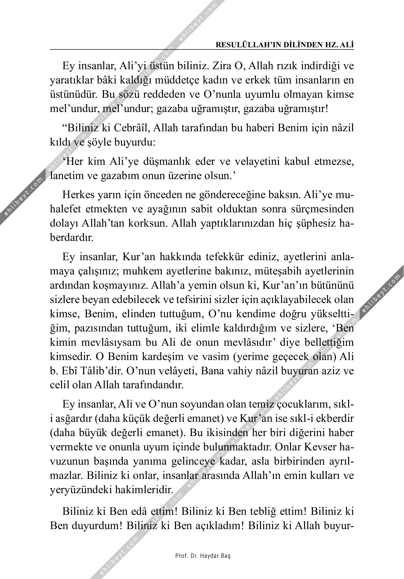 Ey insanlar, Ali'yi üstün biliniz. Zira O, Allah rızık indirdiği ve yaratıklar bâki kaldığı müddetçe kadın ve erkek tüm insanların en üstünüdür. Bu sözü reddeden ve O'nunla uyumlu olmayan kimse mel'undur, mel'undur; gazaba uğramıştır, gazaba uğramıştır! "Biliniz ki Cebrâîl, Allah tarafından bu haberi Benim için nâzil kıldı ve şöyle buyurdu: `Her kim Ali'ye düşmanlık eder ve velayetini kabul etmezse, lanetim ve gazabım onun üzerine olsun.' Herkes yarın için önceden ne göndereceğine baksın. Ali'ye muhalefet etmekten ve ayağının sabit olduktan sonra sürçmesinden dolayı Allah'tan korksun. Allah yaptıklarınızdan hiç şüphesiz haberdardır. Ey insanlar, Kur'an hakkında tefekkür ediniz, ayetlerini anlamaya çalışınız; muhkem ayetlerine bakınız, müteşabih ayetlerinin ardından koşmayınız. Allah'a yemin olsun ki, Kur'an'ın bütününü sizlere beyan edebilecek ve tefsirini sizler için açıklayabilecek olan kimse, Benim, elinden tuttuğum, O'nu kendime doğru yükselttiğim, pazısından tuttuğum, iki elimle kaldırdığım ve sizlere, `Ben kimin mevlâsıysam bu Ali de onun mevlâsıdır' diye bellettiğim kimsedir. […]