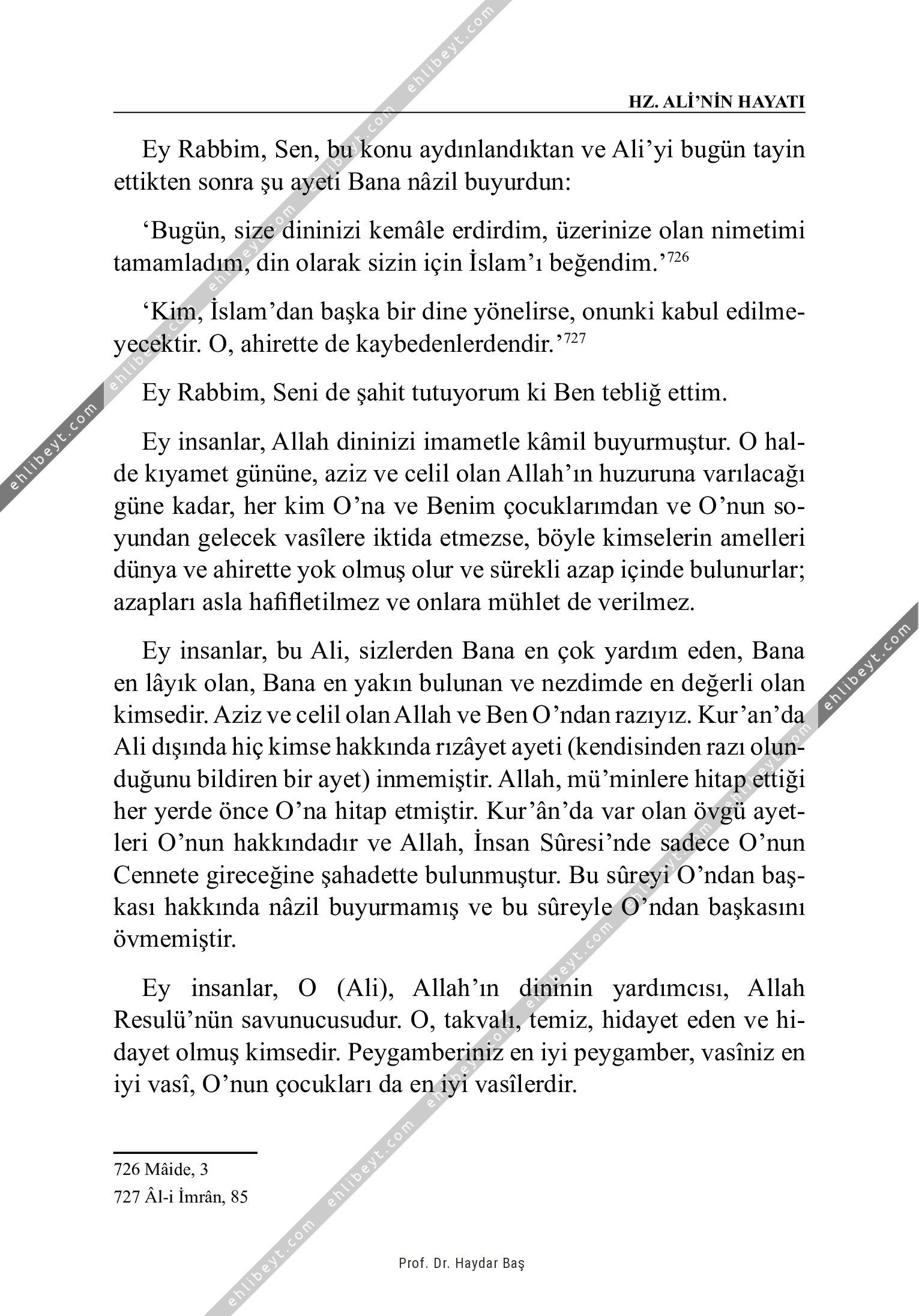 Ey Rabbim, Sen, bu konu aydınlandıktan ve Ali'yi bugün tayin ettikten sonra şu ayeti Bana nâzil buyurdun: `Bugün, size dininizi kemâle erdirdim, üzerinize olan nimetimi tamamladım, din olarak sizin için İslam'ı beğendim.'726 `Kim, İslam'dan başka bir dine yönelirse, onunki kabul edilmeyecektir. O, ahirette de kaybedenlerdendir.'727 Ey Rabbim, Seni de şahit tutuyorum ki Ben tebliğ ettim. Ey insanlar, Allah dininizi imametle kâmil buyurmuştur. O halde kıyamet gününe, aziz ve celil olan Allah'ın huzuruna varılacağı güne kadar, her kim O'na ve Benim çocuklarımdan ve O'nun soyundan gelecek vasîlere iktida etmezse, böyle kimselerin amelleri dünya ve ahirette yok olmuş olur ve sürekli azap içinde bulunurlar; azapları asla hafifletilmez ve onlara mühlet de verilmez. Ey insanlar, bu Ali, sizlerden Bana en çok yardım eden, Bana en lâyık olan, Bana en yakın bulunan ve nezdimde en değerli olan kimsedir. Aziz ve celil olan Allah ve Ben O'ndan razıyız. Kur'an'da Ali dışında hiç […]