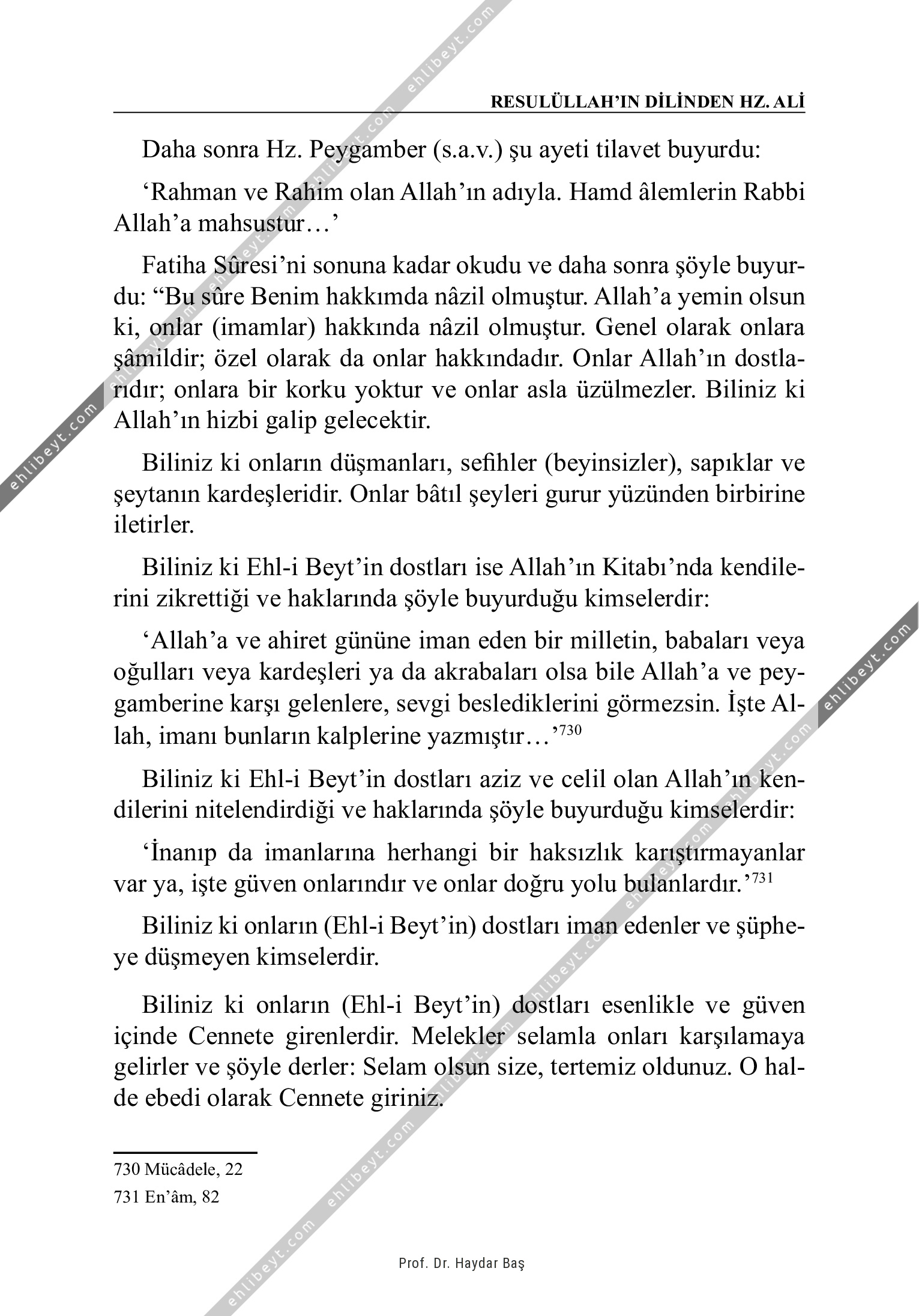 Daha sonra Hz. Peygamber (s.a.v.) şu ayeti tilavet buyurdu: `Rahman ve Rahim olan Allah'ın adıyla. Hamd âlemlerin Rabbi Allah'a mahsustur...' Fatiha Sûresi'ni sonuna kadar okudu ve daha sonra şöyle buyurdu: "Bu sûre Benim hakkımda nâzil olmuştur. Allah'a yemin olsun ki, onlar (imamlar) hakkında nâzil olmuştur. Genel olarak onlara şâmildir; özel olarak da onlar hakkındadır. Onlar Allah'ın dostlarıdır; onlara bir korku yoktur ve onlar asla üzülmezler. Biliniz ki Allah'ın hizbi galip gelecektir. Biliniz ki onların düşmanları, sefihler (beyinsizler), sapıklar ve şeytanın kardeşleridir. Onlar bâtıl şeyleri gurur yüzünden birbirine iletirler. Biliniz ki Ehl-i Beyt'in dostları ise Allah'ın Kitabı'nda kendilerini zikrettiği ve haklarında şöyle buyurduğu kimselerdir: `Allah'a ve ahiret gününe iman eden bir milletin, babaları veya oğulları veya kardeşleri ya da akrabaları olsa bile Allah'a ve peygamberine karşı gelenlere, sevgi beslediklerini görmezsin. İşte Allah, imanı bunların kalplerine yazmıştır...'730 Biliniz ki Ehl-i Beyt'in dostları aziz ve celil olan Allah'ın […]