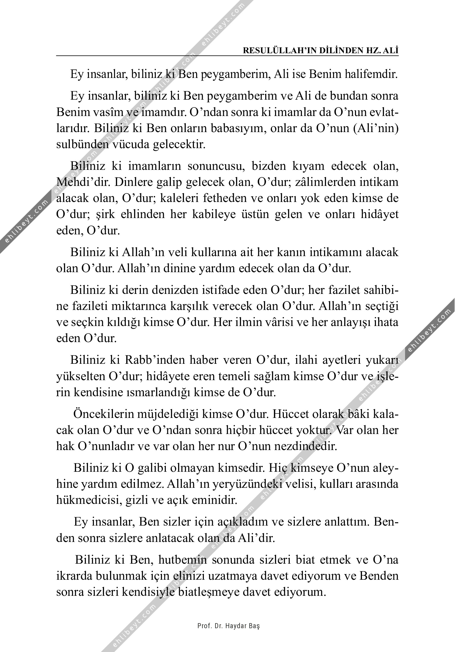 Ey insanlar, biliniz ki Ben peygamberim, Ali ise Benim halifemdir. Ey insanlar, biliniz ki Ben peygamberim ve Ali de bundan sonra Benim vasîm ve imamdır. O'ndan sonra ki imamlar da O'nun evlatlarıdır. Biliniz ki Ben onların babasıyım, onlar da O'nun (Ali'nin) sulbünden vücuda gelecektir. Biliniz ki imamların sonuncusu, bizden kıyam edecek olan, Mehdi'dir. Dinlere galip gelecek olan, O'dur; zâlimlerden intikam alacak olan, O'dur; kaleleri fetheden ve onları yok eden kimse de O'dur; şirk ehlinden her kabileye üstün gelen ve onları hidâyet eden, O'dur. Biliniz ki Allah'ın veli kullarına ait her kanın intikamını alacak olan O'dur. Allah'ın dinine yardım edecek olan da O'dur. Biliniz ki derin denizden istifade eden O'dur; her fazilet sahibine fazileti miktarınca karşılık verecek olan O'dur. Allah'ın seçtiği ve seçkin kıldığı kimse O'dur. Her ilmin vârisi ve her anlayışı ihata eden O'dur. Biliniz ki Rabb'inden haber veren O'dur, ilahi ayetleri yukarı yükselten O'dur; hidâyete eren temeli […]