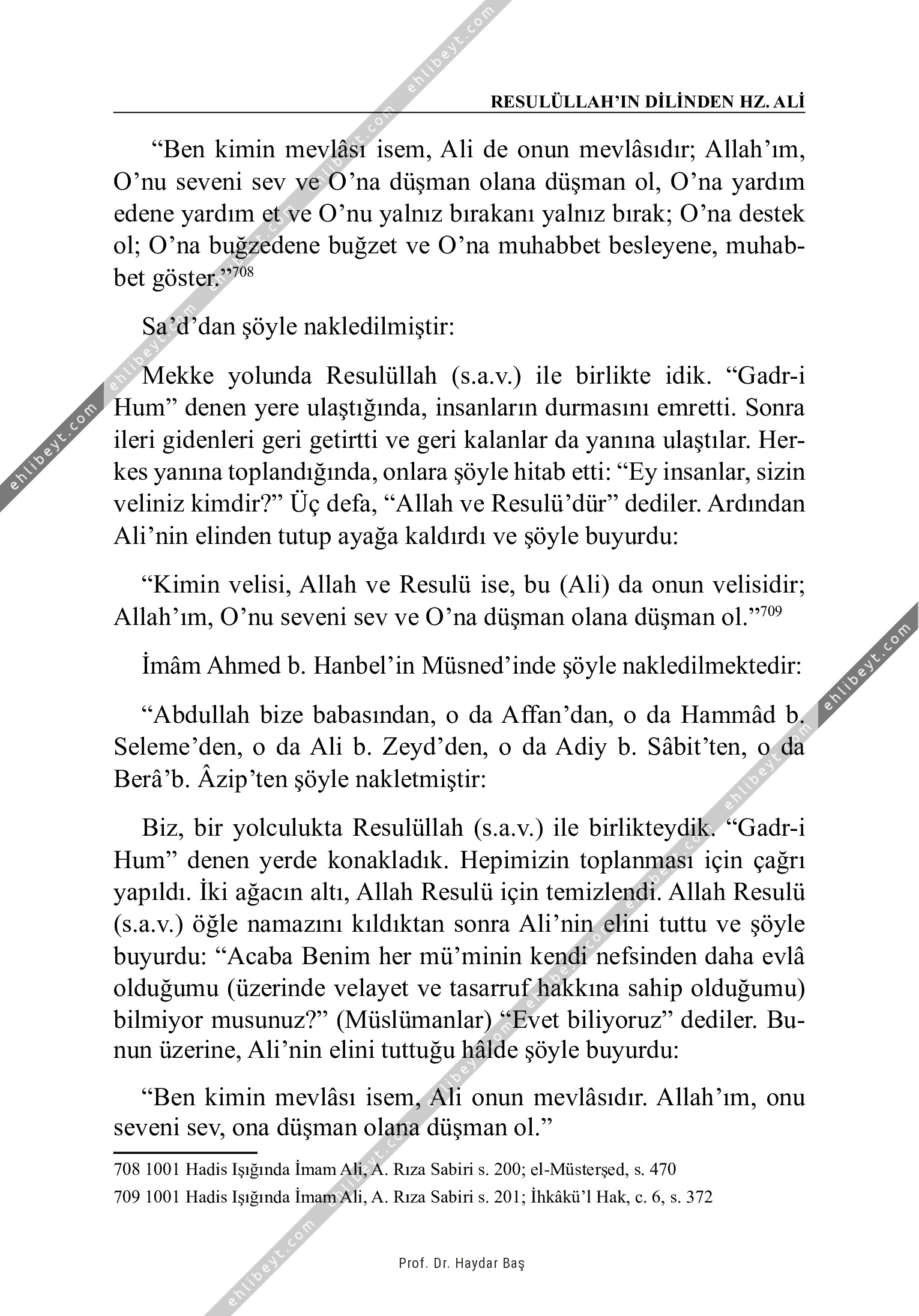 "Ben kimin mevlâsı isem, Ali de onun mevlâsıdır; Allah'ım, O'nu seveni sev ve O'na düşman olana düşman ol, O'na yardım edene yardım et ve O'nu yalnız bırakanı yalnız bırak; O'na destek ol; O'na buğzedene buğzet ve O'na muhabbet besleyene, muhabbet göster."708 Sa'd'dan şöyle nakledilmiştir: Mekke yolunda Resulüllah (s.a.v.) ile birlikte idik. "Gadr-i Hum" denen yere ulaştığında, insanların durmasını emretti. Sonra ileri gidenleri geri getirtti ve geri kalanlar da yanına ulaştılar. Herkes yanına toplandığında, onlara şöyle hitab etti: "Ey insanlar, sizin veliniz kimdir?" Üç defa, "Allah ve Resulü'dür" dediler. Ardından Ali'nin elinden tutup ayağa kaldırdı ve şöyle buyurdu: "Kimin velisi, Allah ve Resulü ise, bu (Ali) da onun velisidir; Allah'ım, O'nu seveni sev ve O'na düşman olana düşman ol."709 İmâm Ahmed b. Hanbel'in Müsned'inde şöyle nakledilmektedir: "Abdullah bize babasından, o da Affan'dan, o da Hammâd b. Seleme'den, o da Ali b. Zeyd'den, o da Adiy b. Sâbit'ten, o da […]