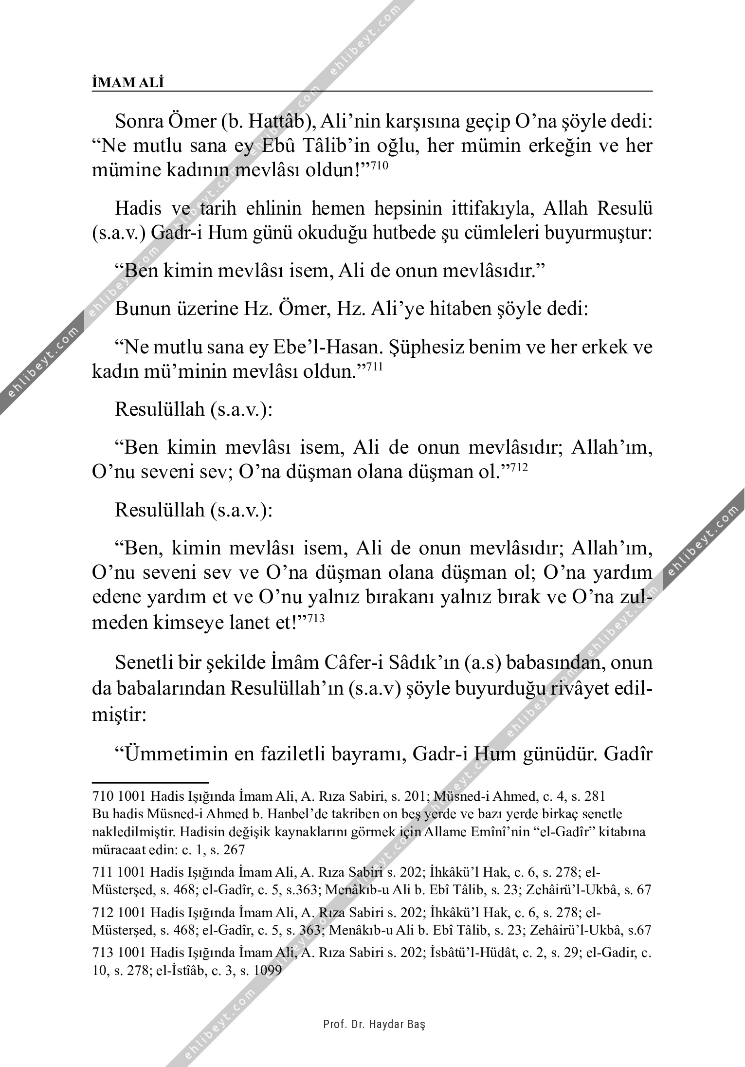 Sonra Ömer (b. Hattâb), Ali'nin karşısına geçip O'na şöyle dedi: "Ne mutlu sana ey Ebû Tâlib'in oğlu, her mümin erkeğin ve her mümine kadının mevlâsı oldun!"710 Hadis ve tarih ehlinin hemen hepsinin ittifakıyla, Allah Resulü (s.a.v.) Gadr-i Hum günü okuduğu hutbede şu cümleleri buyurmuştur: "Ben kimin mevlâsı isem, Ali de onun mevlâsıdır." Bunun üzerine Hz. Ömer, Hz. Ali'ye hitaben şöyle dedi: "Ne mutlu sana ey Ebe'l-Hasan. Şüphesiz benim ve her erkek ve kadın mü'minin mevlâsı oldun."711 Resulüllah (s.a.v.): "Ben kimin mevlâsı isem, Ali de onun mevlâsıdır; Allah'ım, O'nu seveni sev; O'na düşman olana düşman ol."712 Resulüllah (s.a.v.): "Ben, kimin mevlâsı isem, Ali de onun mevlâsıdır; Allah'ım, O'nu seveni sev ve O'na düşman olana düşman ol; O'na yardım edene yardım et ve O'nu yalnız bırakanı yalnız bırak ve O'na zulmeden kimseye lanet et!"713 Senetli bir şekilde İmâm Câfer-i Sâdık'ın (a.s) babasından, onun da babalarından Resulüllah'ın (s.a.v) şöyle buyurduğu rivâyet edil[…]