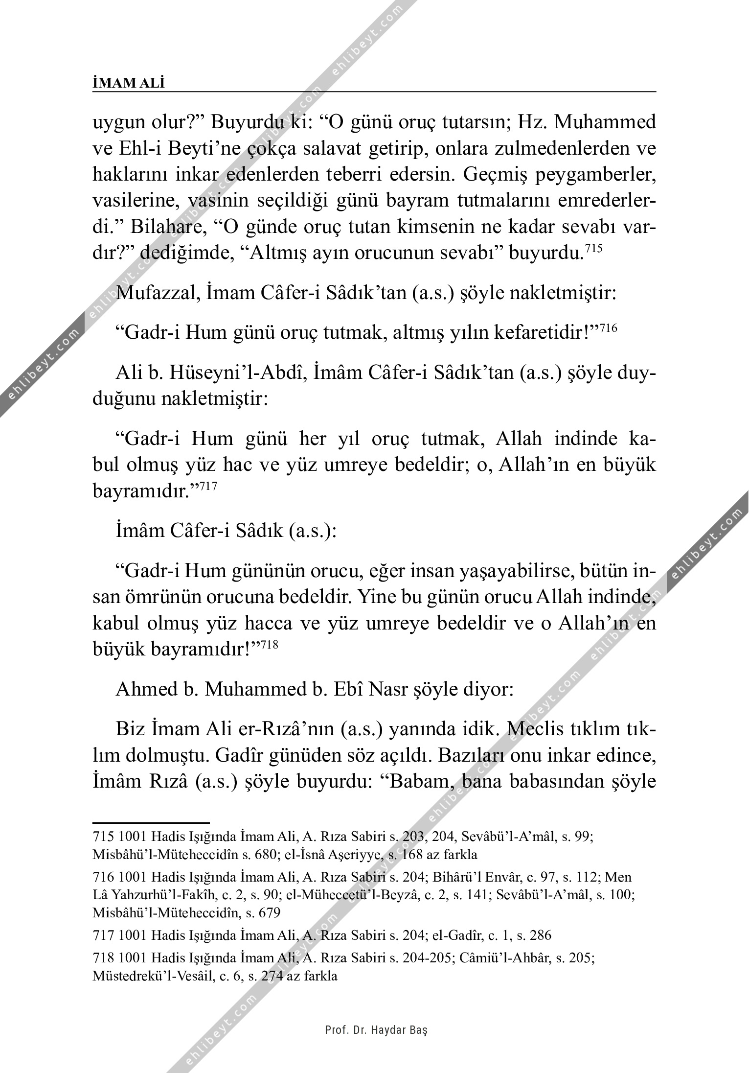 uygun olur?" Buyurdu ki: "O günü oruç tutarsın; Hz. Muhammed ve Ehl-i Beyti'ne çokça salavat getirip, onlara zulmedenlerden ve haklarını inkar edenlerden teberri edersin. Geçmiş peygamberler, vasilerine, vasinin seçildiği günü bayram tutmalarını emrederlerdi." Bilahare, "O günde oruç tutan kimsenin ne kadar sevabı vardır?" dediğimde, "Altmış ayın orucunun sevabı" buyurdu.715 Mufazzal, İmam Câfer-i Sâdık'tan (a.s.) şöyle nakletmiştir: "Gadr-i Hum günü oruç tutmak, altmış yılın kefaretidir!"716 Ali b. Hüseyni'l-Abdî, İmâm Câfer-i Sâdık'tan (a.s.) şöyle duyduğunu nakletmiştir: "Gadr-i Hum günü her yıl oruç tutmak, Allah indinde kabul olmuş yüz hac ve yüz umreye bedeldir; o, Allah'ın en büyük bayramıdır."717 İmâm Câfer-i Sâdık (a.s.): "Gadr-i Hum gününün orucu, eğer insan yaşayabilirse, bütün insan ömrünün orucuna bedeldir. Yine bu günün orucu Allah indinde, kabul olmuş yüz hacca ve yüz umreye bedeldir ve o Allah'ın en büyük bayramıdır!"718 Ahmed b. Muhammed b. Ebî Nasr şöyle diyor: Biz İmam Ali er-Rızâ'nın (a.s.) […]