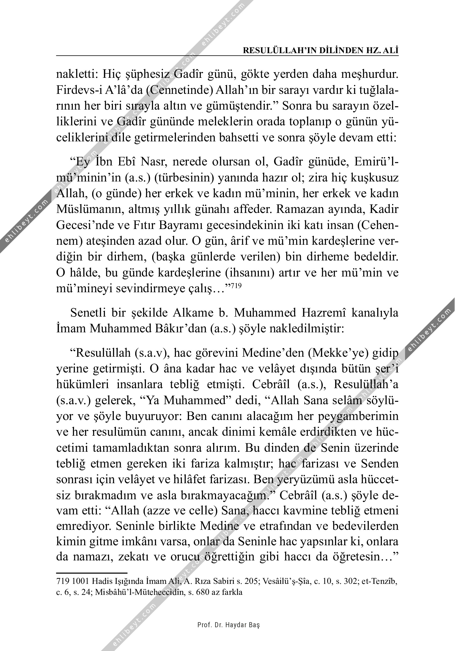 nakletti: Hiç şüphesiz Gadîr günü, gökte yerden daha meşhurdur. Firdevs-i A'lâ'da (Cennetinde) Allah'ın bir sarayı vardır ki tuğlalarının her biri sırayla altın ve gümüştendir." Sonra bu sarayın özelliklerini ve Gadîr gününde meleklerin orada toplanıp o günün yüceliklerini dile getirmelerinden bahsetti ve sonra şöyle devam etti: "Ey İbn Ebî Nasr, nerede olursan ol, Gadîr günüde, Emirü'lmü'minin'in (a.s.) (türbesinin) yanında hazır ol; zira hiç kuşkusuz Allah, (o günde) her erkek ve kadın mü'minin, her erkek ve kadın Müslümanın, altmış yıllık günahı affeder. Ramazan ayında, Kadir Gecesi'nde ve Fıtır Bayramı gecesindekinin iki katı insan (Cehennem) ateşinden azad olur. O gün, ârif ve mü'min kardeşlerine verdiğin bir dirhem, (başka günlerde verilen) bin dirheme bedeldir. O hâlde, bu günde kardeşlerine (ihsanını) artır ve her mü'min ve mü'mineyi sevindirmeye çalış..."719 Senetli bir şekilde Alkame b. Muhammed Hazremî kanalıyla İmam Muhammed Bâkır'dan (a.s.) şöyle nakledilmiştir: "Resulüllah (s.a.v), hac görevini Medine'den (Mekke'ye) […]