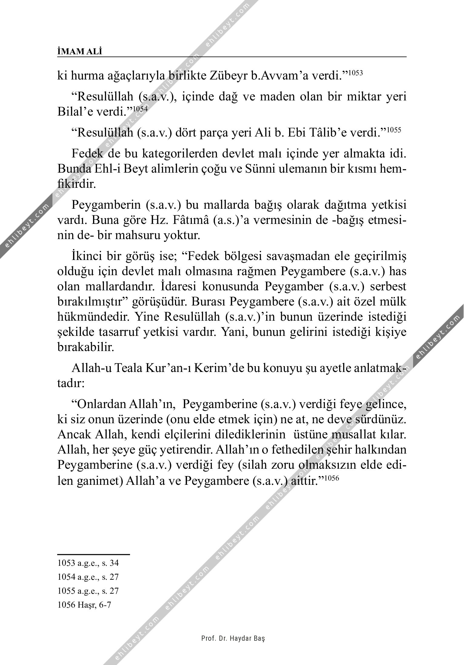 ki hurma ağaçlarıyla birlikte Zübeyr b.Avvam'a verdi."1053 "Resulüllah (s.a.v.), içinde dağ ve maden olan bir miktar yeri Bilal'e verdi."1054 "Resulüllah (s.a.v.) dört parça yeri Ali b. Ebi Tâlib'e verdi."1055 Fedek de bu kategorilerden devlet malı içinde yer almakta idi. Bunda Ehl-i Beyt alimlerin çoğu ve Sünni ulemanın bir kısmı hemfikirdir. Peygamberin (s.a.v.) bu mallarda bağış olarak dağıtma yetkisi vardı. Buna göre Hz. Fâtımâ (a.s.)'a vermesinin de -bağış etmesinin debir mahsuru yoktur. İkinci bir görüş ise; "Fedek bölgesi savaşmadan ele geçirilmiş olduğu için devlet malı olmasına rağmen Peygambere (s.a.v.) has olan mallardandır. İdaresi konusunda Peygamber (s.a.v.) serbest bırakılmıştır" görüşüdür. Burası Peygambere (s.a.v.) ait özel mülk hükmündedir. Yine Resulüllah (s.a.v.)'in bunun üzerinde istediği şekilde tasarruf yetkisi vardır. Yani, bunun gelirini istediği kişiye bırakabilir. Allah-u Teala Kur'an-ı Kerim'de bu konuyu şu ayetle anlatmaktadır: "Onlardan Allah'ın, Peygamberine (s.a.v.) verdiği feye gelince, ki siz onun üzerinde (onu elde etmek için) ne […]